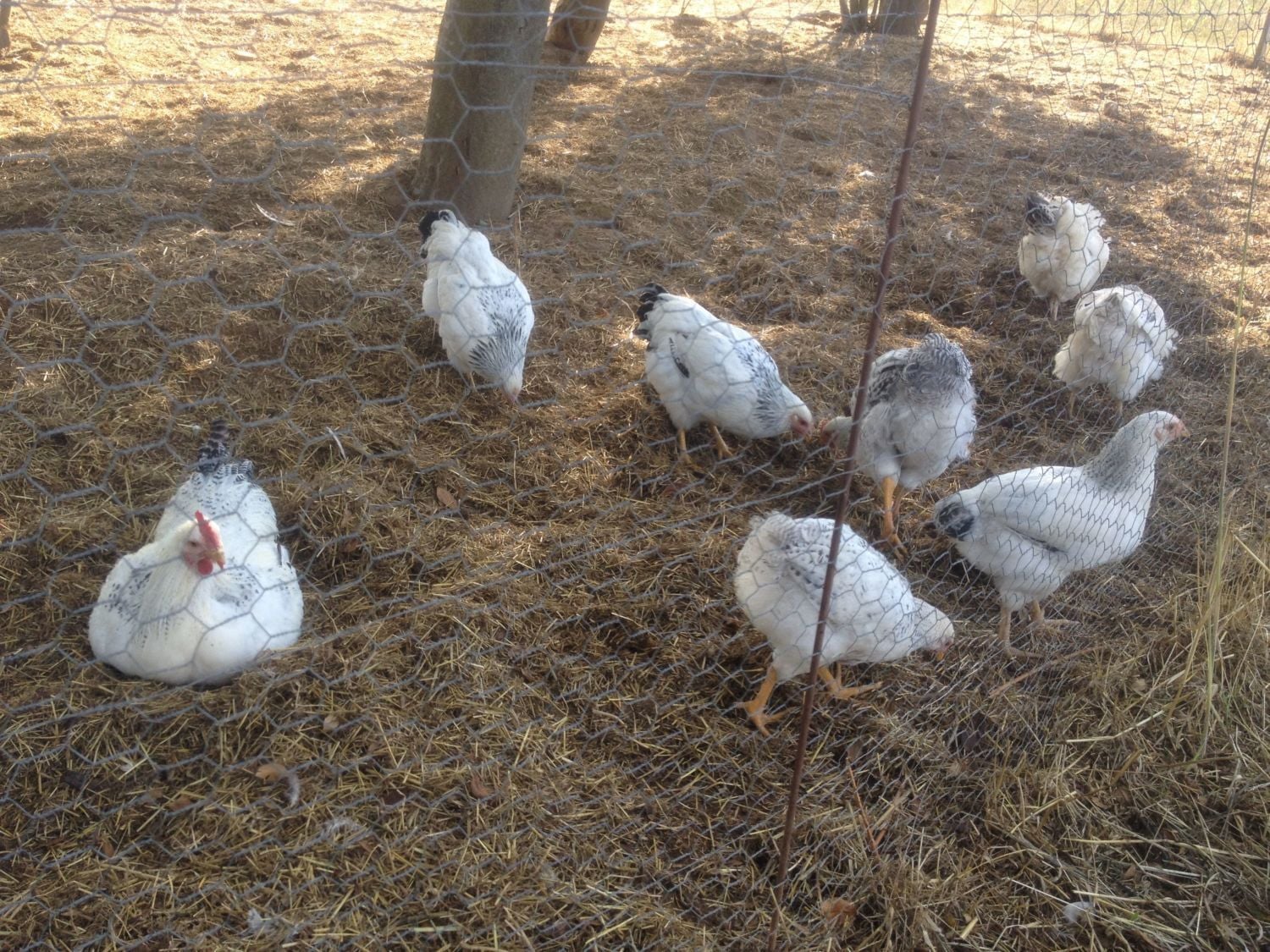The Delaware Cockerels are actually being pretty nice. I didn't feel too much pressure to segregate them. I do, however, want to keep better track of them (particularly their wings at this stage) and make sure the younger birds have good access to food and roosts, so I put the 9 oldest Delaware cockerels in a pallet coop (no photos of that coop yet). You can see these guys aren't exactly SOP quality ...