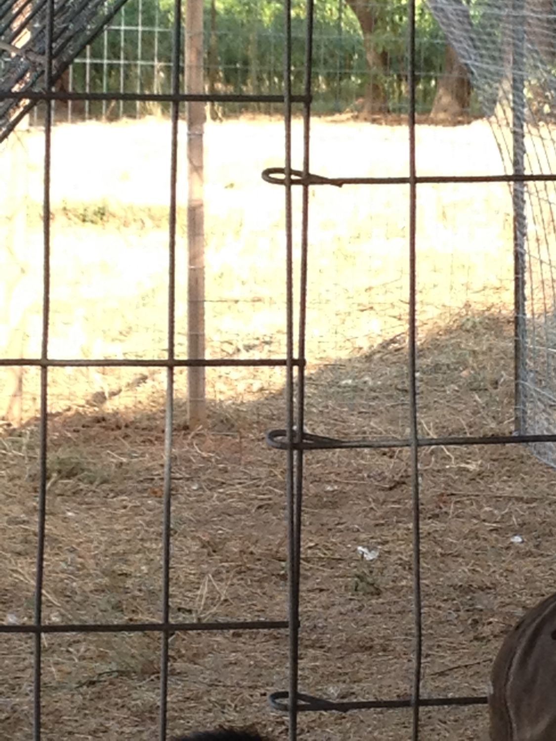 I think the modules are pretty awesome. They are just wire-wrapped cattle panels bent up between T-Posts. Each one (or two) could be made into a small coop/cage for breeding purposes when I have more than one trio working for me. In that case, I'll probably pre-wrap each module in shade cloth and greenhouse plastic and partition off part of a pasture to make a run. Here I just strung them all together and secured them with wire twist ties (google re-bar ties for the general idea of the pre-looped wire ties and the twisting tool we used) and put it in the middle of the free-range area. I made the door at the top of the coop/run out of a cattle panel, just bent some end wires to make hinges (full disclosure, I invited someone with man hands to do that part for me) ... here is a photo of the door hinges before we put the wire on the door end. The idea is the door can be lifted off the ground a bit when it is swung ... to clear any bumps and stuff. It works slick. I did add a little wire "skirt" all the way around the bottom of this coop/run to discourage predators and digging under.
