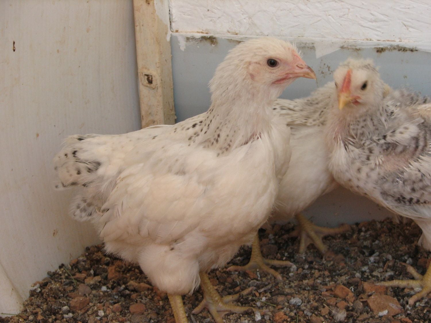 Here is one of the small ones in a group I call the Doves~she's the one on the left and I love her shape, her head and her good survival and foraging characteristics. This is the WRs and two Del smallest pullets that don't have much black on them...I love that they all look like white doves.