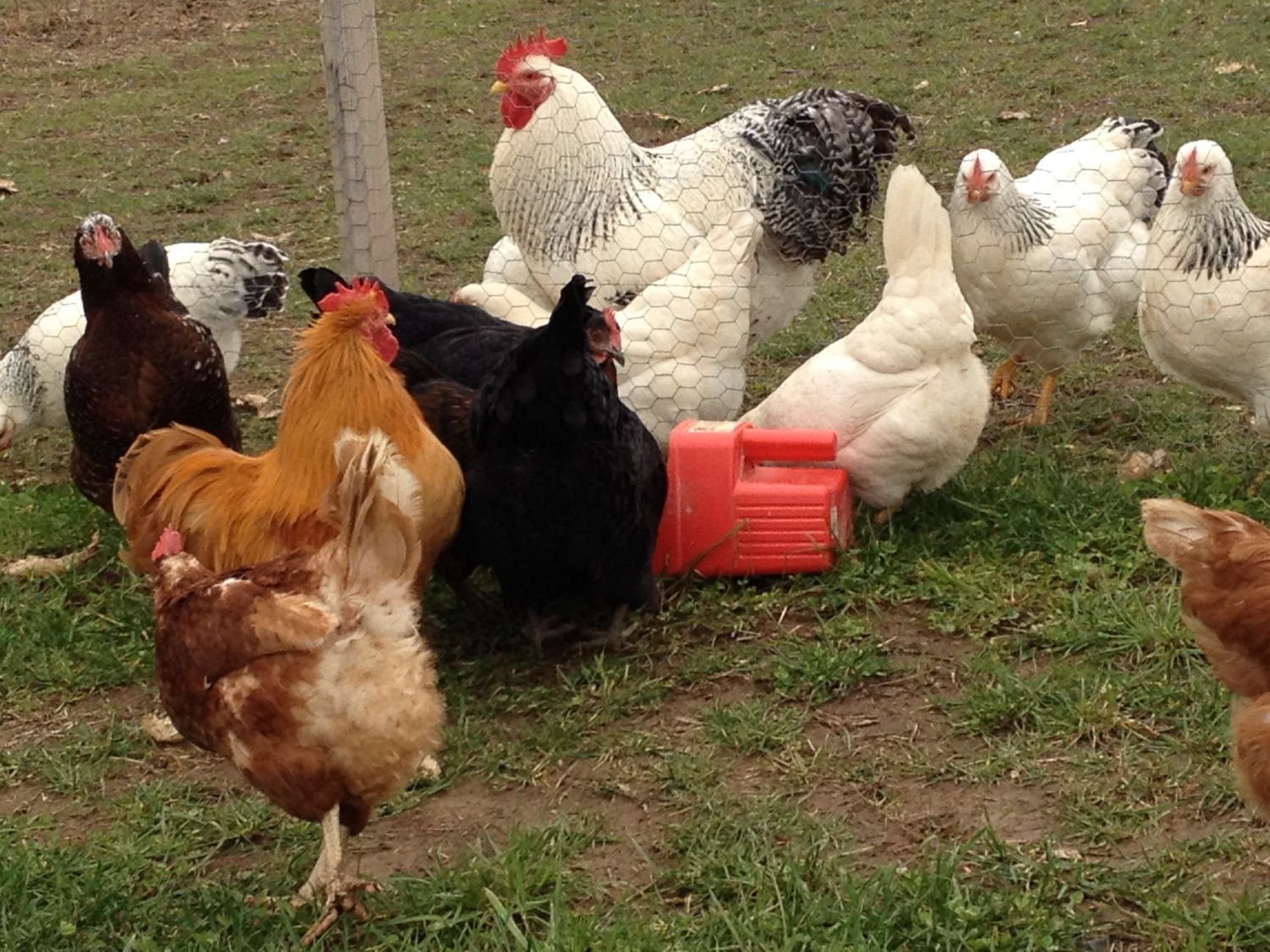 They're all standing around the scratch scoop ... PapaDel & pullets on the far side of the fence, Ruffles & hatchery hens on the near side. Of course one of the few birds still molting is right in front.