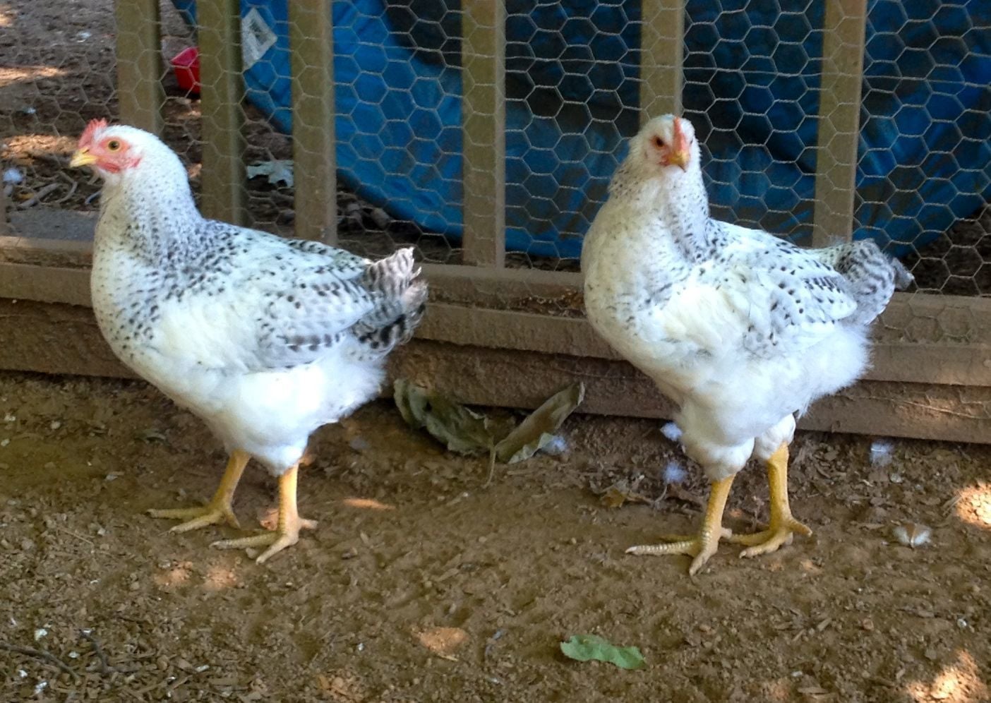 A couple of the cockerels we moved into the Cockerel Colony last night. We seem to have 3 that look like the one on the left, and then the taller, skinnier guy on the right. I like the shape of the one on the left, but they all have too much black. Combs seem okay. Wings seem okay. Legs seem okay.