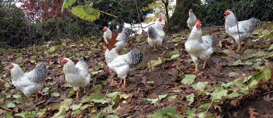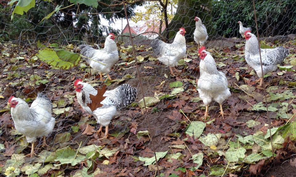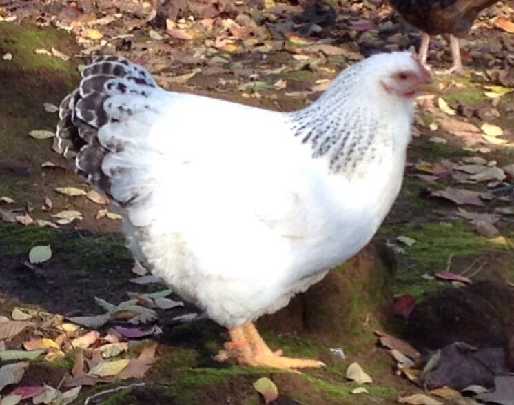 The pullets came to see what I was up to. Their tails have started to come up in the last week or so, so they're looking more "correct." Though I think many of mine have a tilt down toward their front. You can see the dark barring in her tail.