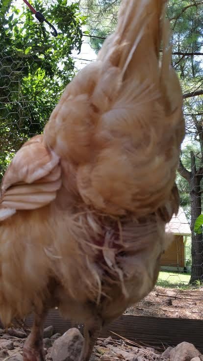 Hello there fellow chicken lovers, I would love to get some help with a possible diagnosis for my favorite gal. The other day (2-3 days ago) I notices more feathers than usual in my coup under where the girls roost. (no rooster). I thought maybe one was just molting. However yesterday, after letting the gals range for most of the day, I noticed when I was getting them in that April, who is usually very bright eyed and bushy tailed so to speak and leader of the pack, was just standing outside the coop like a statue...sort of like a hypnotic state. I picked her up and put her in the coop. Today, I went to make my rounds and she is standing just like that in the water. I looked under her at her vent and she's got a kind of bald spot and watery poop on the feathers around...First time this has ever come up...egg shells are thin and eggs whites watery. As I went to take the pictures, I noticed she's is moving so much slower than normal too. Any ideas? She's 2 years old. Her feed is Purina Layer Crumbles and Manna Oyster Shell in a separate container. The only thing different is I added some Manna Pro Egg Maker supplement to their feed three days ago however I would think that would affect all three chickens wouldn't it?