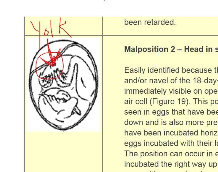 we need to close those holes but first we have to note the yolk position and mark the egg and snap a pic so you know where that yolk is located so we can make the most educated guess as to where its beak is later on..... make sense? see the image below and note where the yolk would be in relation to its body and head? note dip in air cell as well? so if you can make your best guess by looking at your eggs and this pic draw a circle where you think its beak may be.... after you did all that, take a gauze pad and tape it over that hole that is open, doesnt have to be fancy, just close it up to air, you already have antibotic ointment on it so just stop the air to it. and then I would put her back into the incubator until tomorrow morning, if they dont have pips at the other end where you marked or any other place for that matter you can try to save them.... they are so late already I dont think you have anything to loose to be honest unfortunately I wish I could say otherwise, I also just had 4 malpositioned and didnt know it and didnt even get a chance to help them : (.