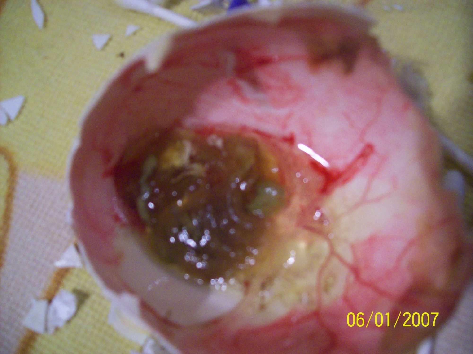 Here's what was left in the egg after I finished. The gosling is covered head to toe in yolk.