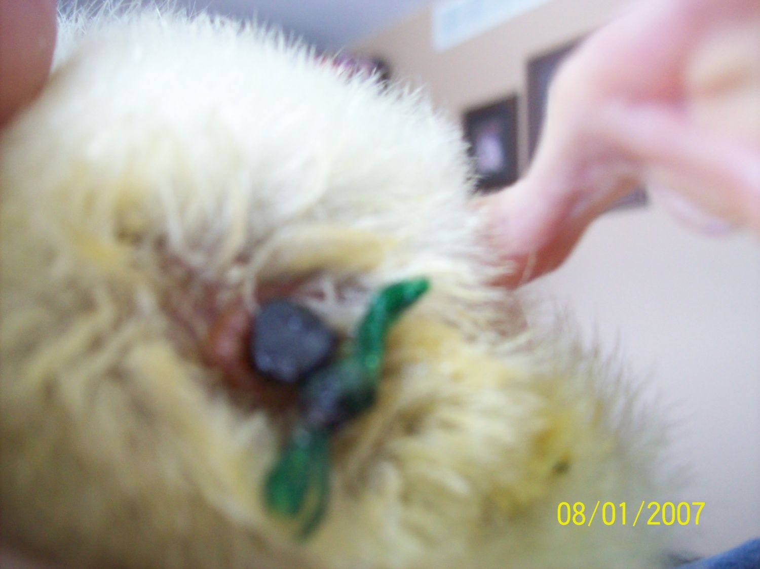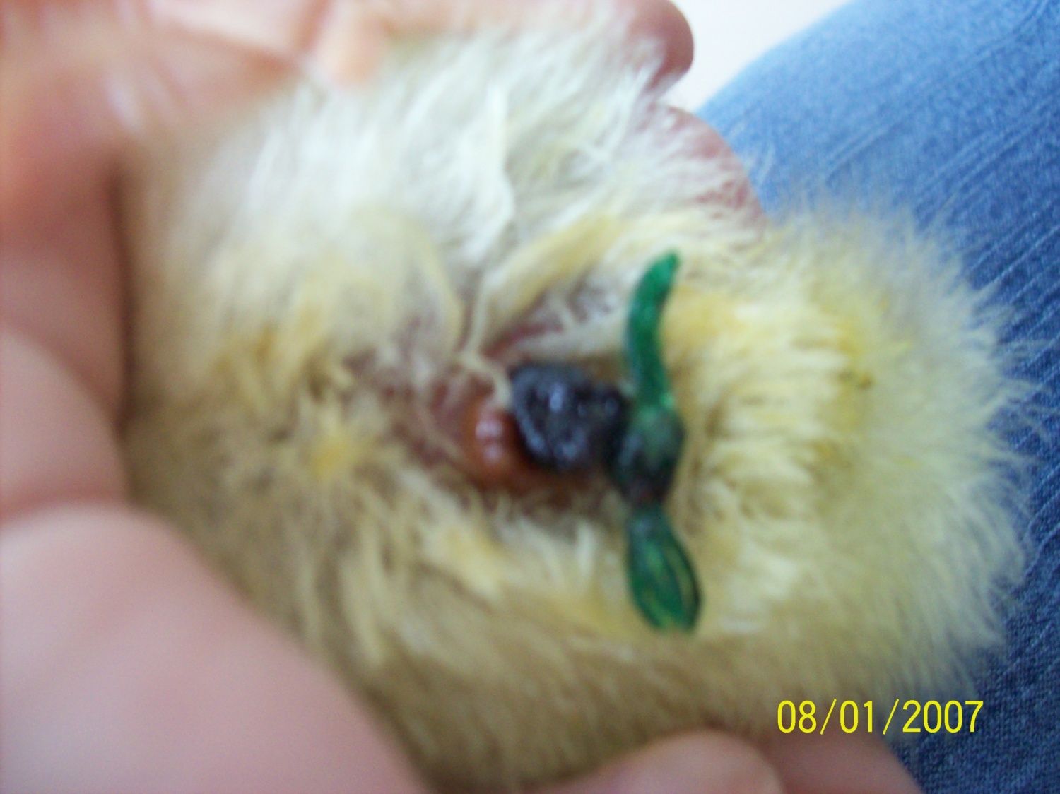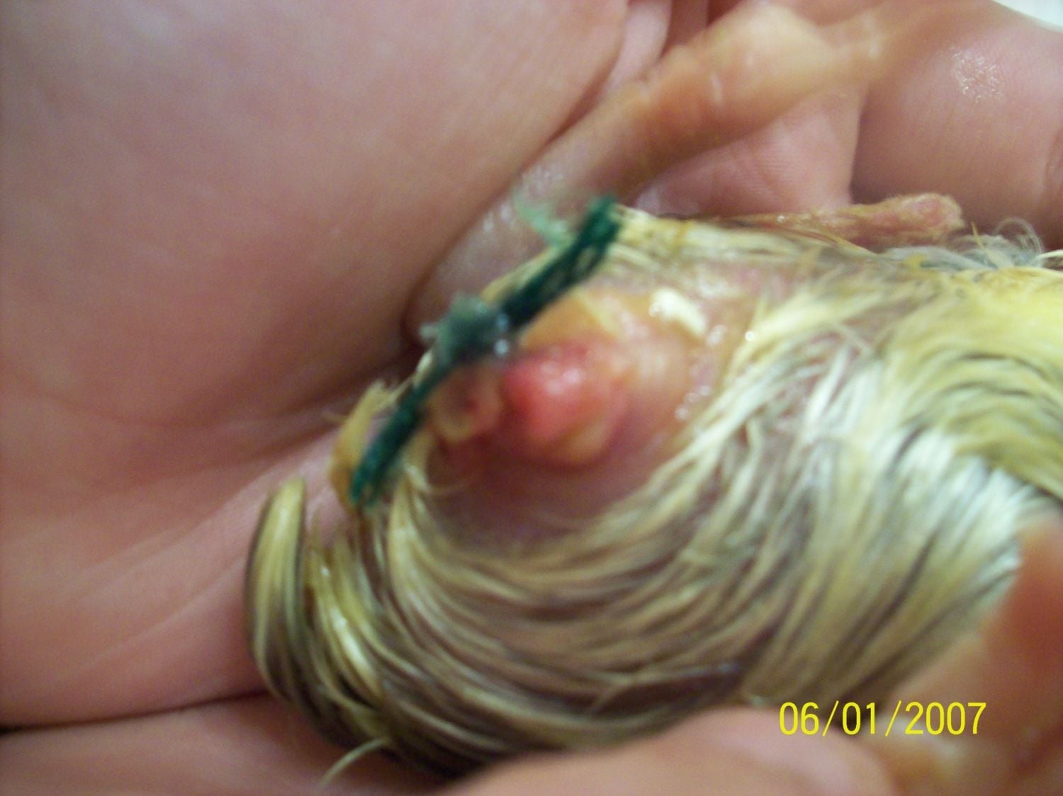 Sally, here are some pictures of her navel. Any recommendations? I was thinking about taking another piece of string and trying to tie off the back object. The black part isn't hard because I keep putting on antibiotics, but I'm worried that she'll get an infection if I stop using the ointment since her navel is still open.