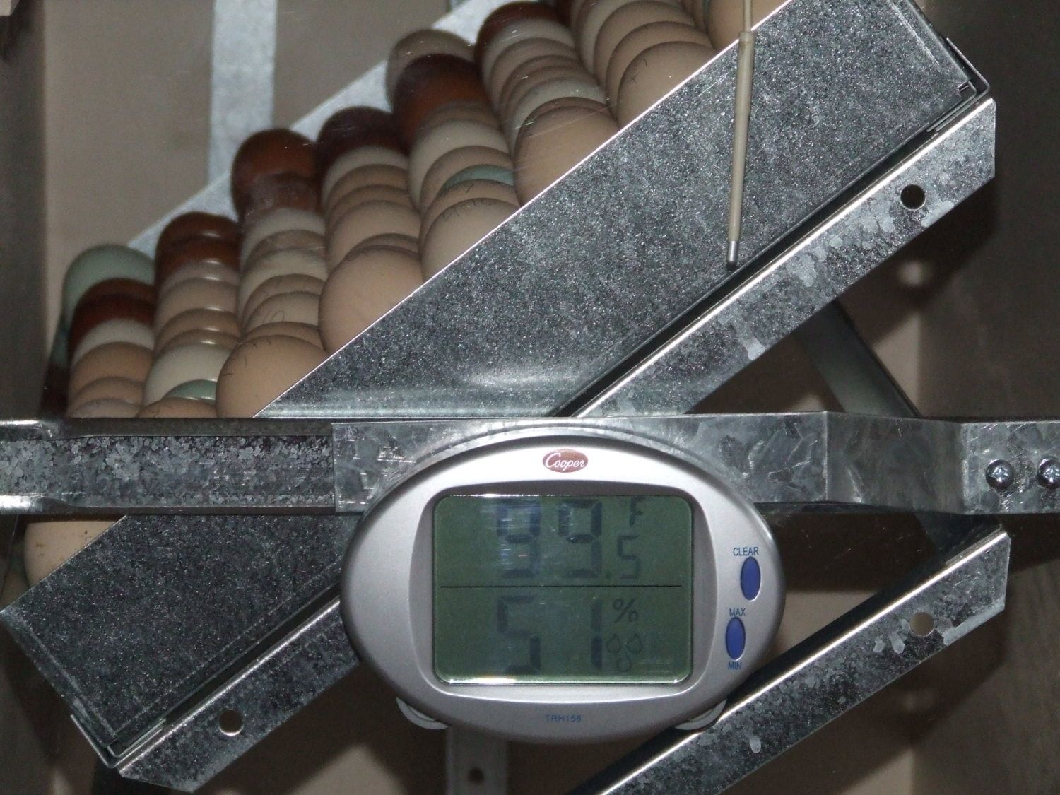 We have a new Dickey. Wondering what you guys have found for accuracy on the thermometer that came with it. Our is reading steady at 99.3 to 99.5. My husband slide a spot check under the front framing, so it's dangling inside the incubator. It's reading 102.3 to 102.5. It is dangling a few inches above the thermometer that comes with the dickey. I thought the spot checks were supposed to be pretty accurate. Should I turn the Dickey down a bit? Here's a pic so you can see where it is dangling in the bator.