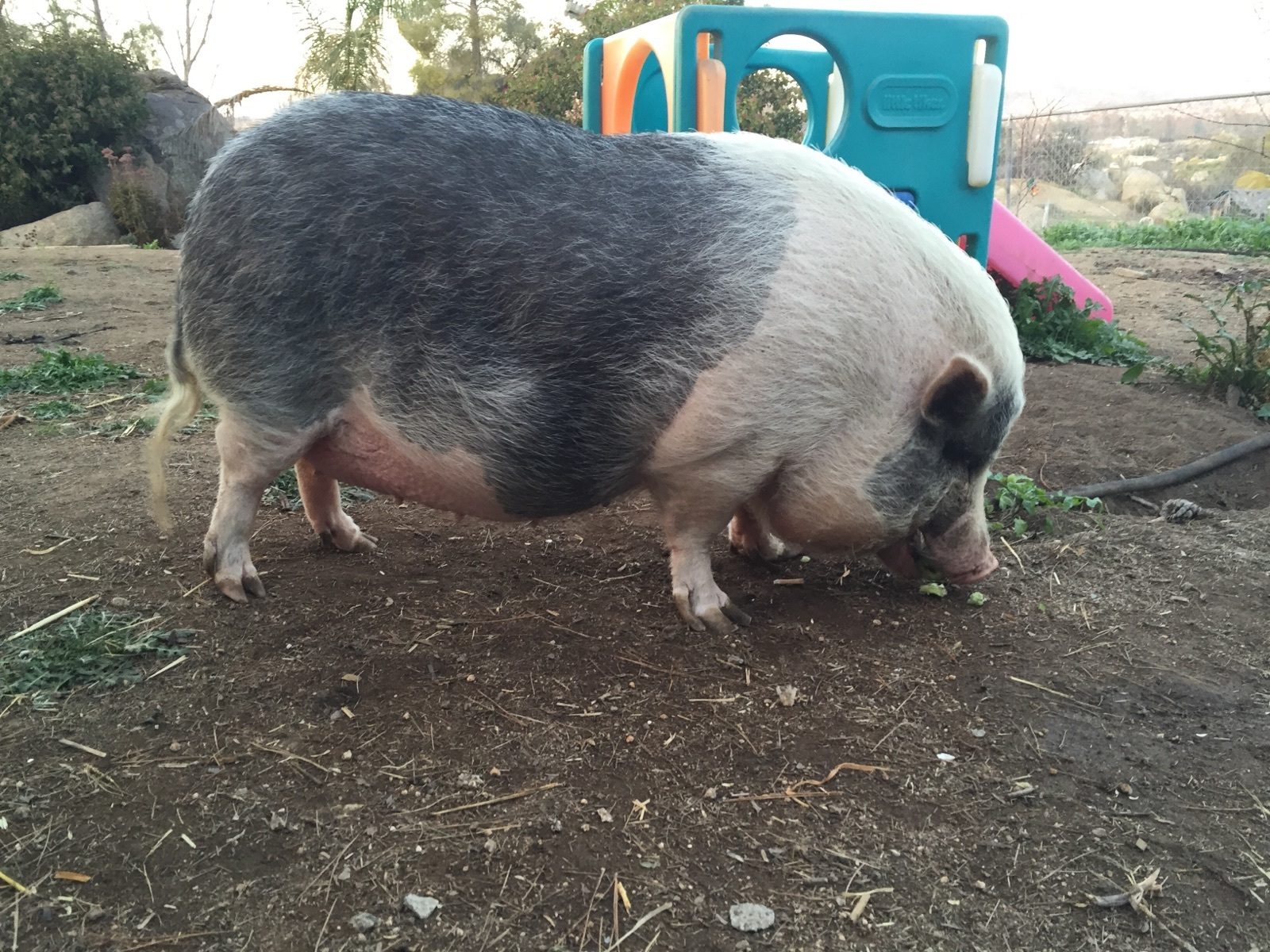 She is a very social pig and is happy to follow us around and is fine hanging out with the dogs in the yard, but gets annoyed if they go into her pen area. She had been rolling for belly rubs but now it seems difficult for her. I am thinking that is because of weight on the hooves which makes it that much more difficult to trim them, so we are getting what we can while she stands and hoping we will soon be able to get her to roll again so we can finish the job faster.