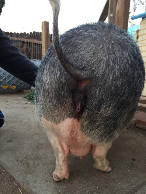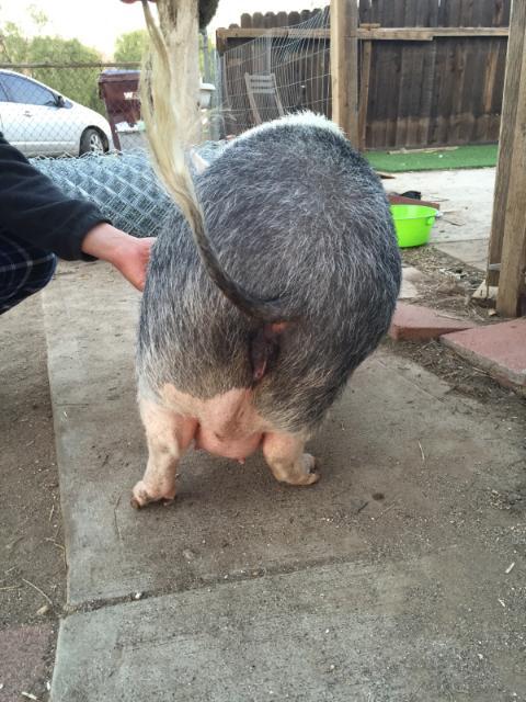 In addition to the hooves, I quickly noticed that her girl bits looked swollen. I thought perhaps it was heat, but it hasn't gone down. Her tail hits it as it wags. This is our first pig so we are inexperienced. I know that pigs are pregnant for 3 months, 3 weeks, and 3 days, but I don't know when she would have mated. She was at the shelter for approximately a month, but she was in a small stall alone so it would have happened before then.