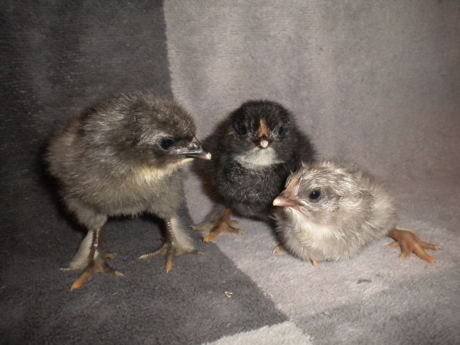 Cochin X Barred Rock chicks (two on the right have the white spot on top of the head)