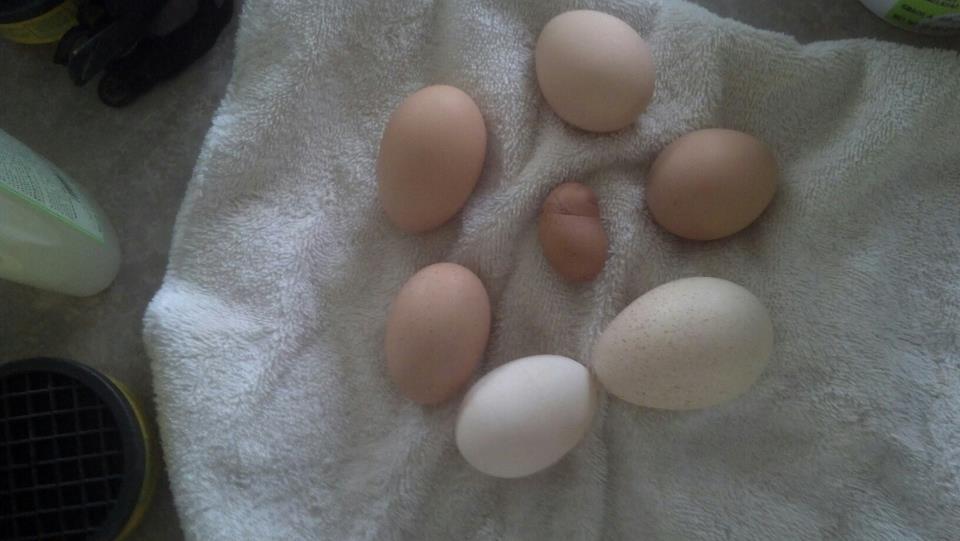 Since I have only had my chickens and turkey since spring...I don't know what it means when you get an egg like the one in the middle...I have two reds in a pen together...they look just alike but the white hen egg comes from one and the one in the middle from the second one...I know I am weird but I am sort of fascinated by the differences in the eggs..color, size, texture and now shape and size at one time...