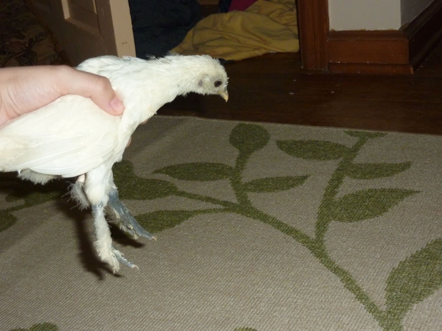 My other chicken with the same problem, and our first disabled chicken, was Spritle. He was a cross-breed from our far but he may have been the one that we assisted in hatching. He was very sweet and lived up in my room in a cage. However, after a long while of him not healing, we had to put him down. I believe we had another similar chicken that had this issue, but it doesn't seem to be marek's as none of the other flock members are showing any symptoms of it (and we have a large flock of various breeds, ages and both roosters and hens).