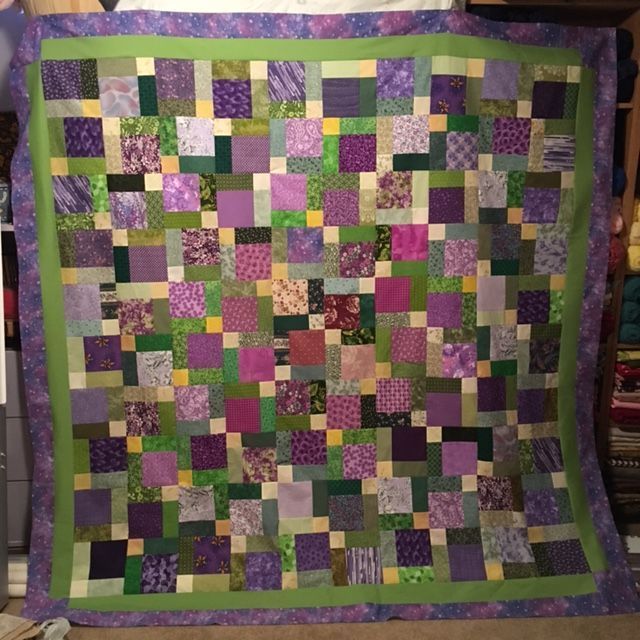 I decided on the lime green (as suggested) and added the purple border that has a variation of purples in it. I think it turned out okay. I may applique a few flowers on it, dispersed randomly.