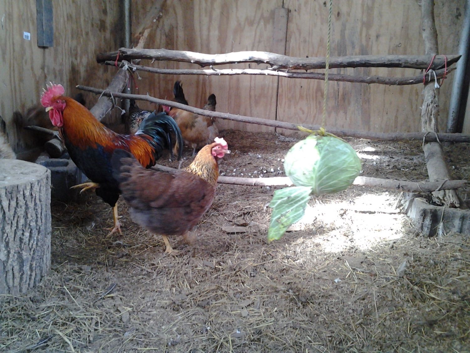 I hung a head of cabbage about a foot from the floor yesterday. They never touched it. I folded a couple leaves down and threw them some pieces this morning, they gobbled up the pieces. Went back out this afternoon and they still haven't touched it, dumb chickens are scared of it.