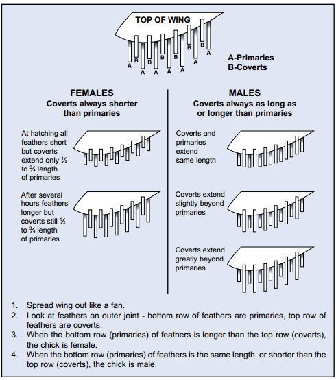 I think it is. There are primary feathers and coverts. The primaries are longer in females. The males primaries are smaller than pullet, but the same size as the coverts. (secondary flight feathers) And again, I could be wrong. I'm gonna send u a link.I thought the feather sexing was top row versus bottom row if the top is longer then the bottom female or if the bottom is longer then the top its male?