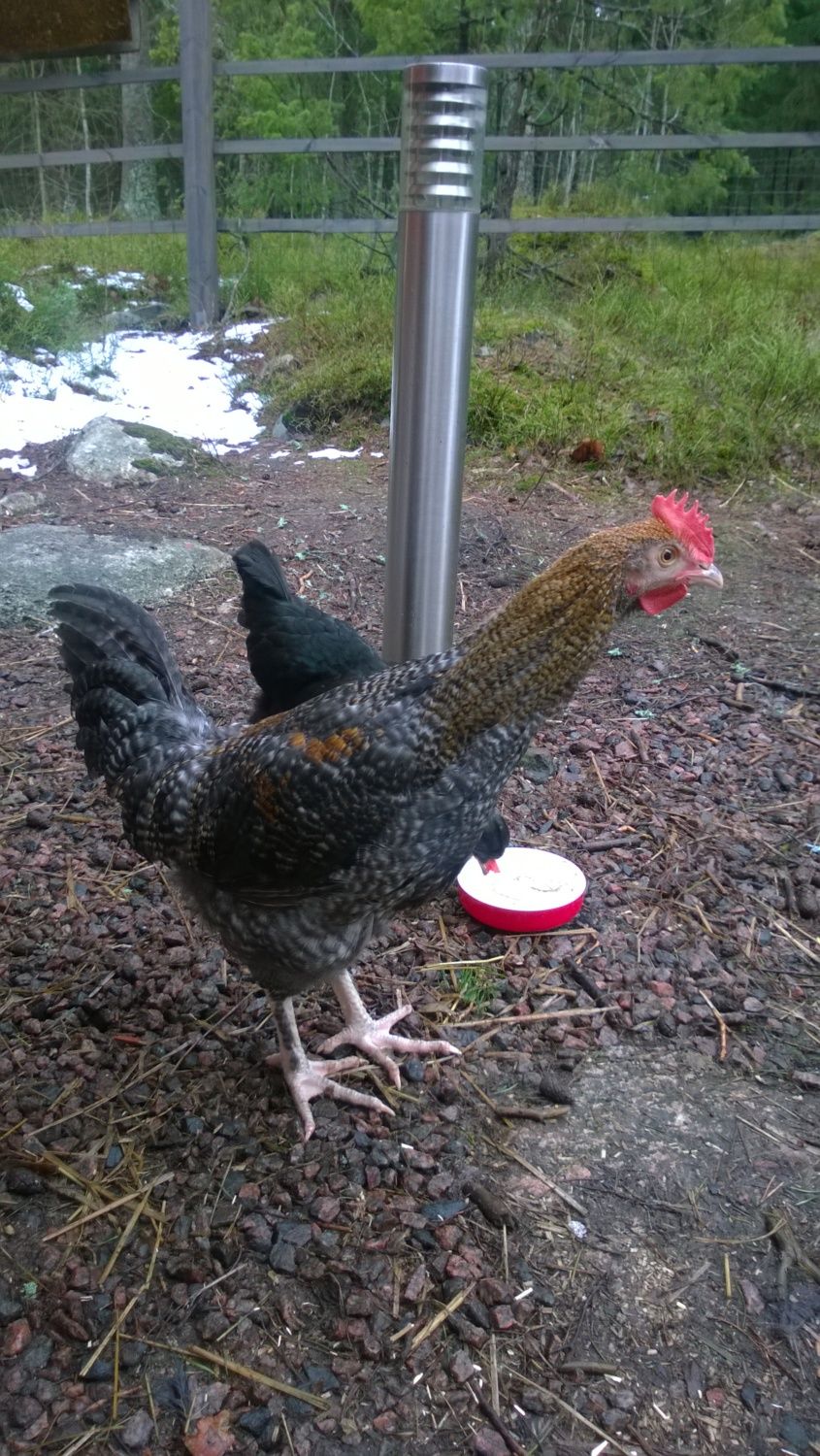 This is the most developed rooster. Töyhtis is hiding behind him, she laid the eggs we hatched for the current batch. Not that she's very visible.