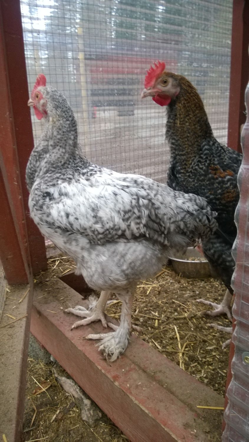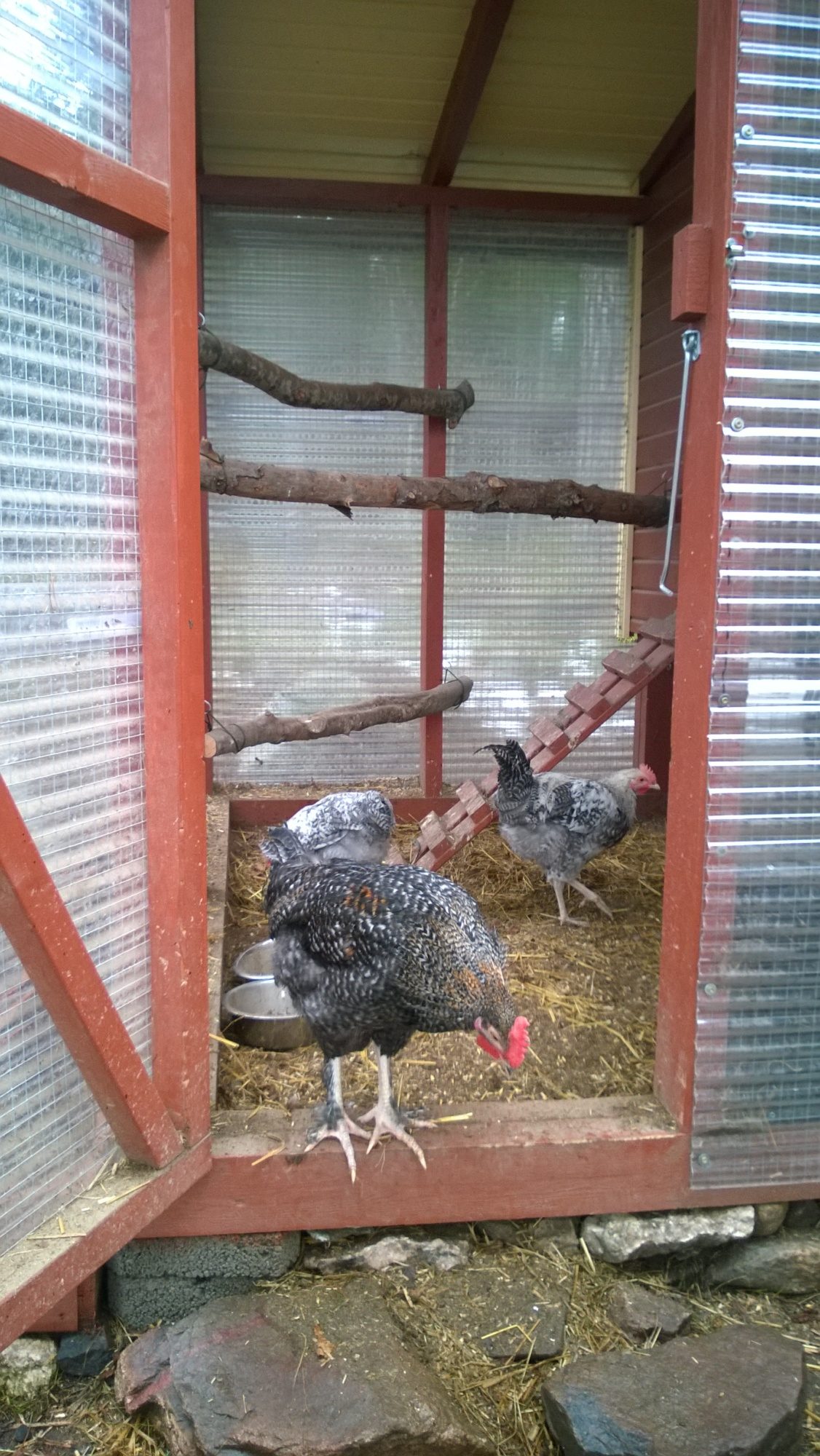 Flappy standing in the doorway. He made a full recovery. He has a lot less tail feathers than the others though, I think they might be picking them.