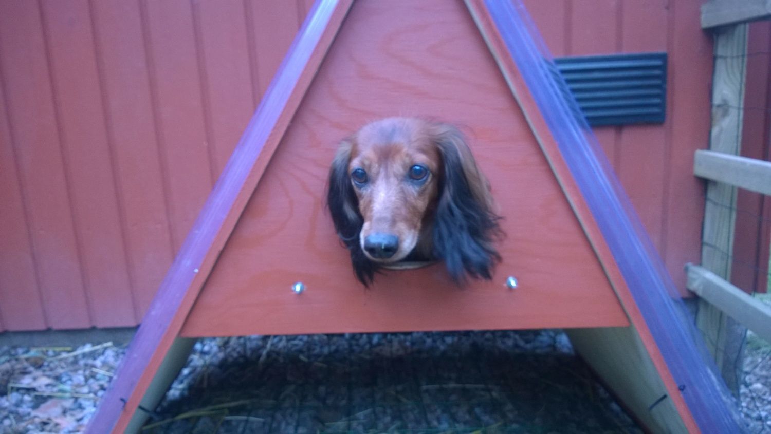 Älize checking out the bunny tractor. I think she believes it's a doghouse.