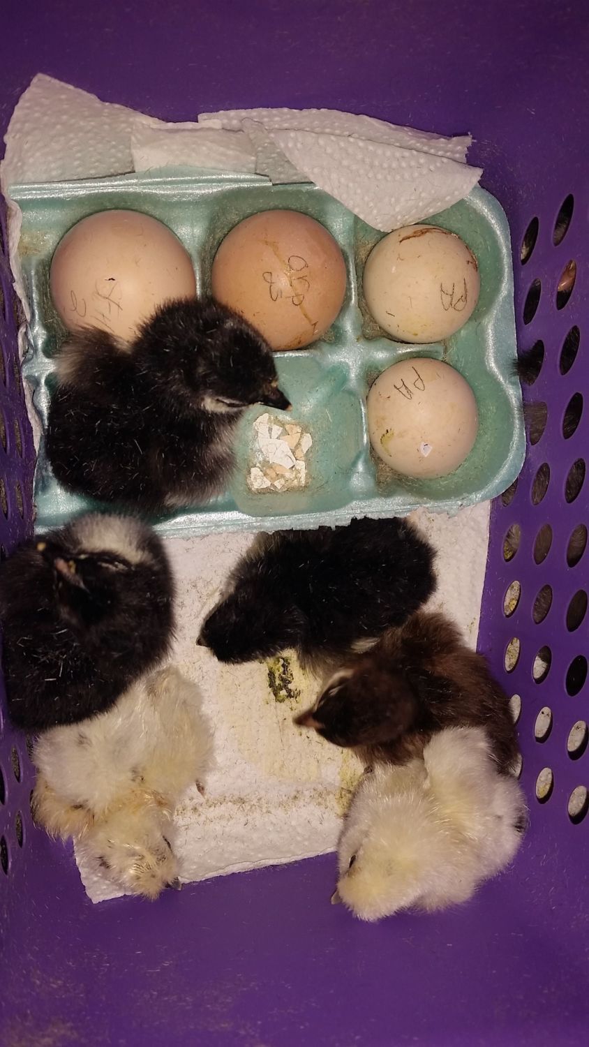 chocolate and black orpingtons and 2 paint silkies. 2 more paint silkie eggs in there and also 1 orpington egg and 1 swedish flower egg.