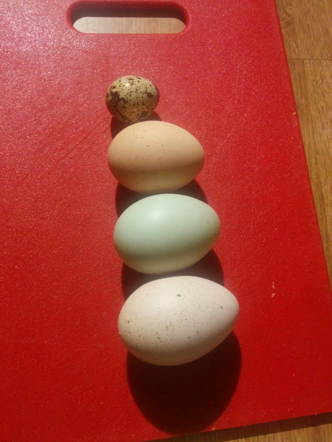 In a row: quail egg, chicken egg, duck egg (Ancona) and turkey egg (Bronze turkey)