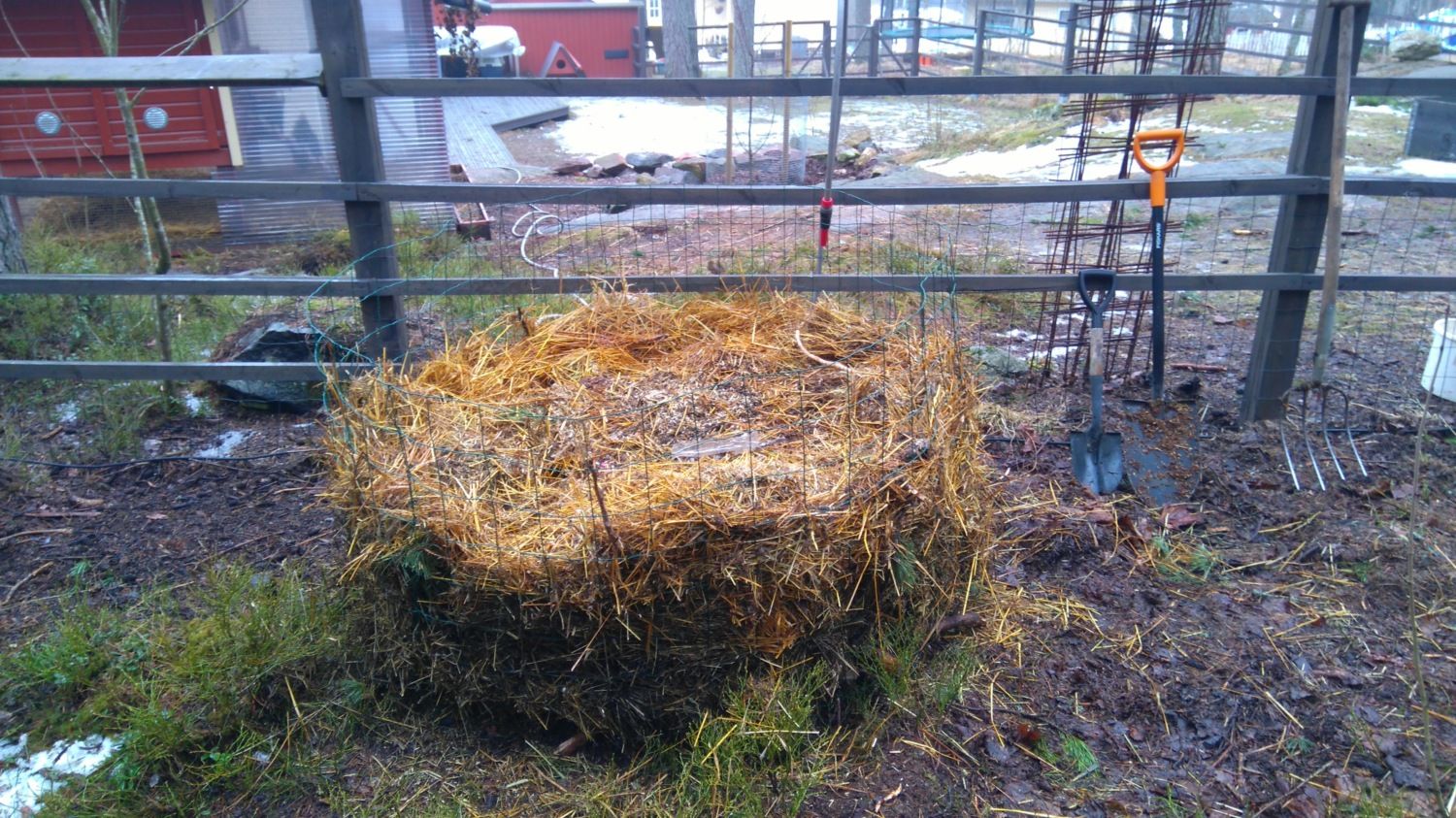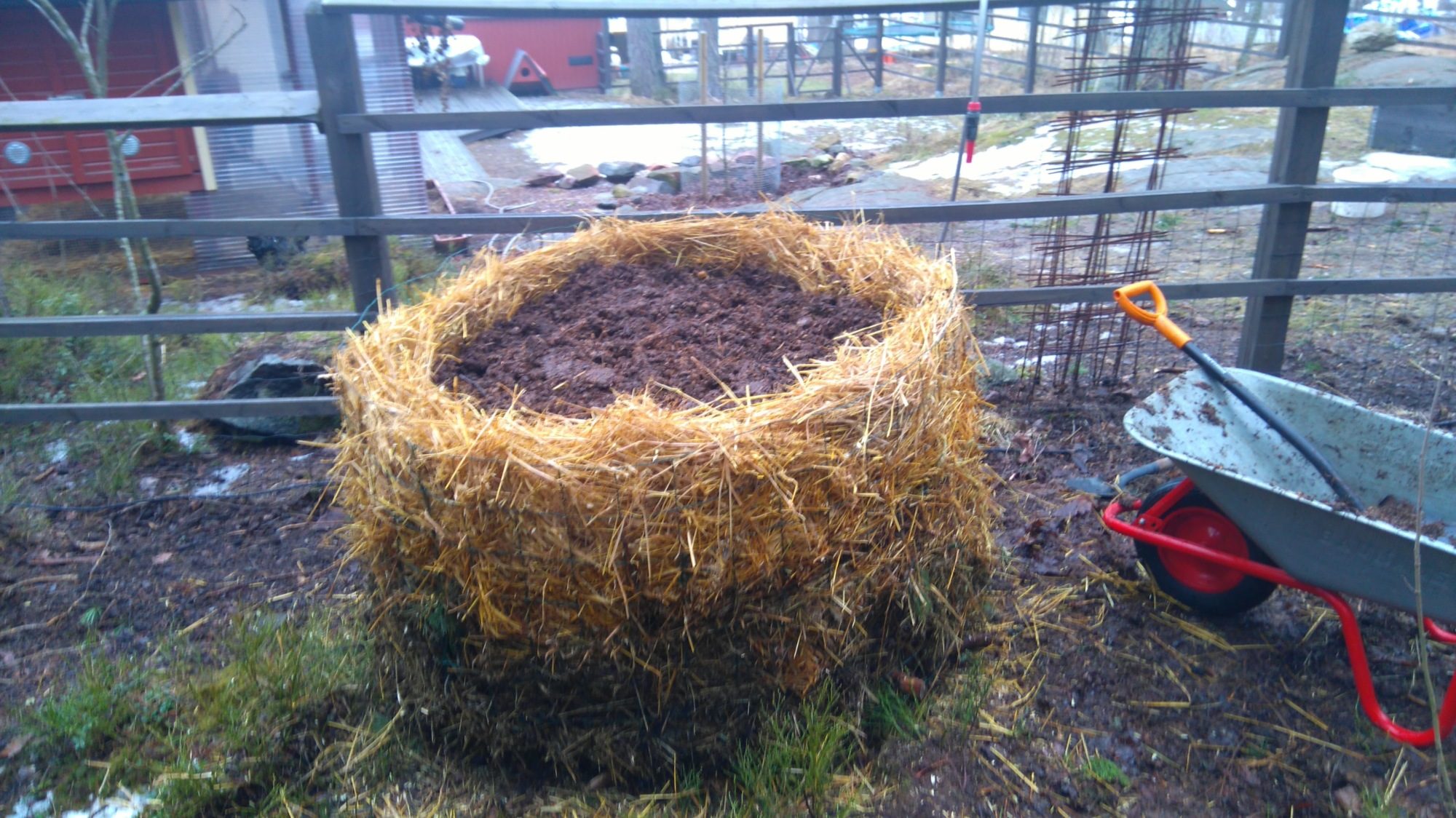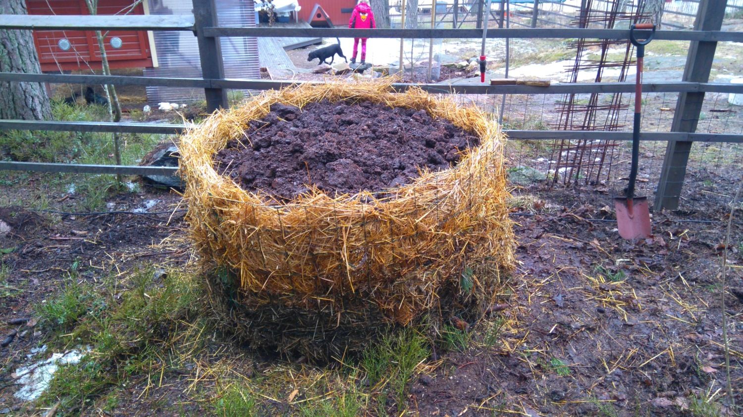 I've been working on our pumpkin patch all day, got a lot of our troublesome spent straw, raw compost and even some vintage compost hid away in it. As it sets I'll have to add some more rested compost still, but the stuff has been sitting in the shadows and was slightly frozen solid still. I chipped away about 5 wheelbarrows of the stuff, until I said it's enough for now. We also hid a ton of dog poop about three feet below the surface inside our pumpkin patch, shouldn't be a bio hazard there but it should provide some much needed nitrogen for all the branches and pieces of wood I placed on the bottom to provide air in the beginning, and moisture retention later on. This thing is about 5 feet across.