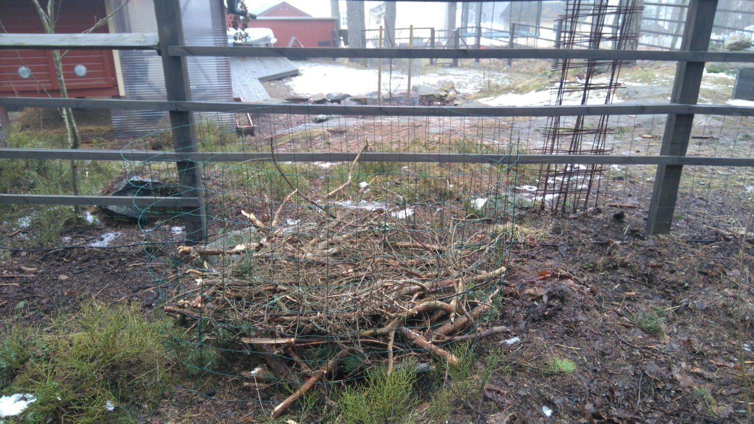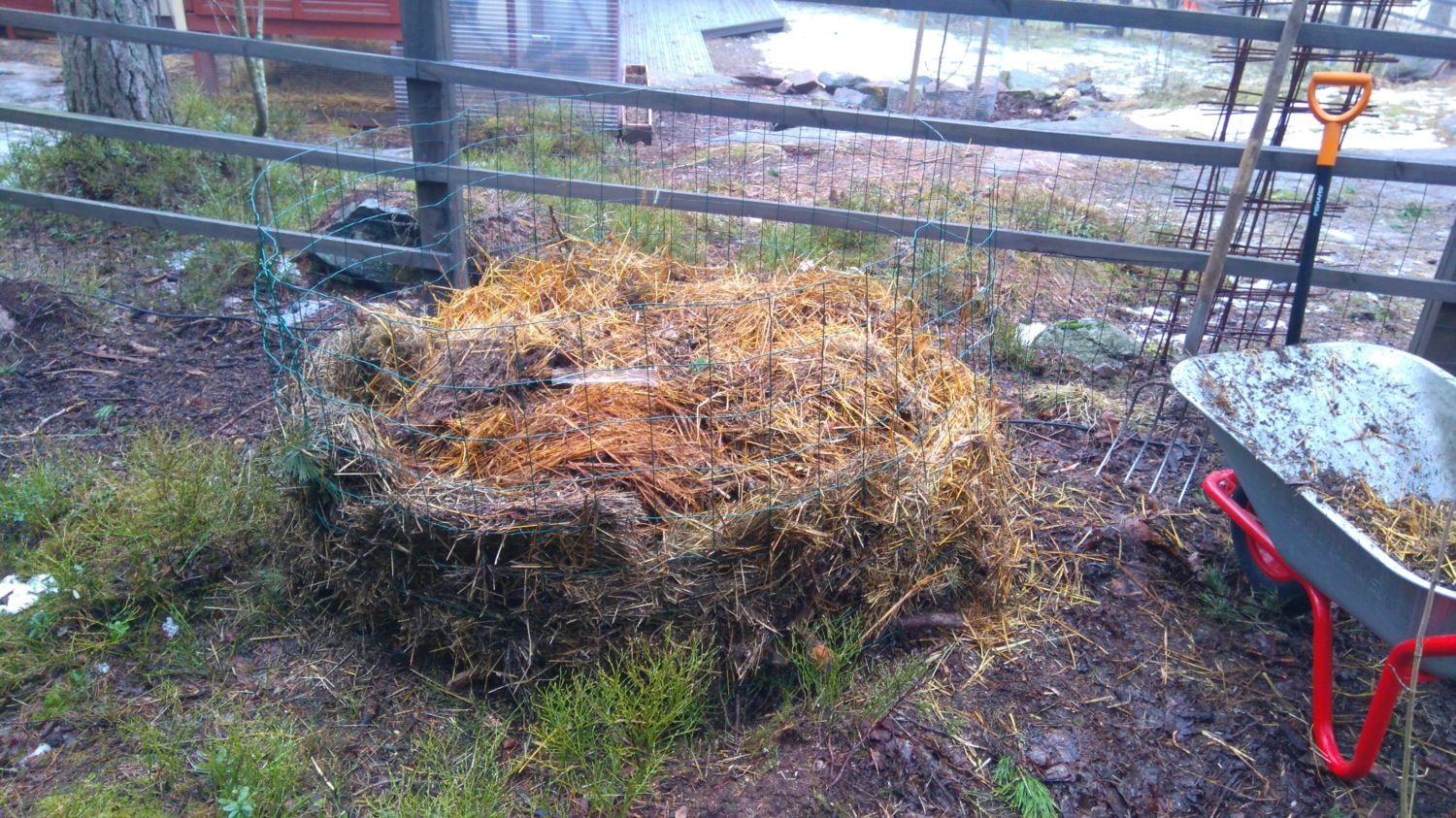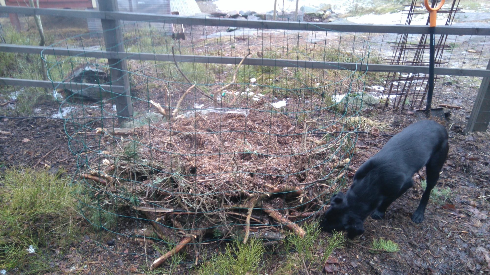 I've been working on our pumpkin patch all day, got a lot of our troublesome spent straw, raw compost and even some vintage compost hid away in it. As it sets I'll have to add some more rested compost still, but the stuff has been sitting in the shadows and was slightly frozen solid still. I chipped away about 5 wheelbarrows of the stuff, until I said it's enough for now. We also hid a ton of dog poop about three feet below the surface inside our pumpkin patch, shouldn't be a bio hazard there but it should provide some much needed nitrogen for all the branches and pieces of wood I placed on the bottom to provide air in the beginning, and moisture retention later on. This thing is about 5 feet across.