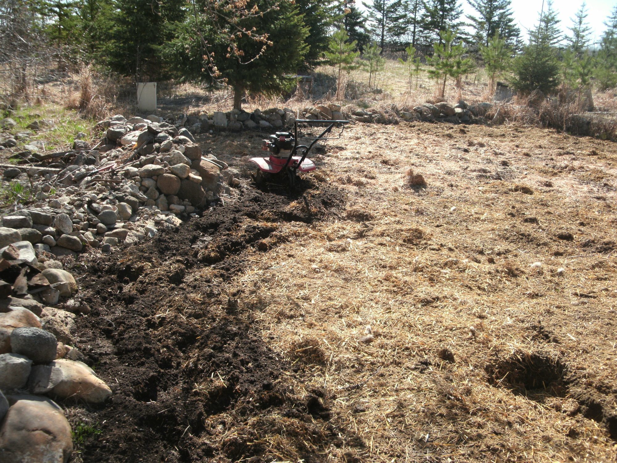 This is the first tilling on the smaller garden , I will or have tilled it five times so now the straw etc has been broken up and is well mixed to the point that you can't see hardly any of it . I normally till five to six times in each garden , till , wait for any growth , till again , repeat untill any weeds etc are all gone .....saves a lot of weeding in the coming months