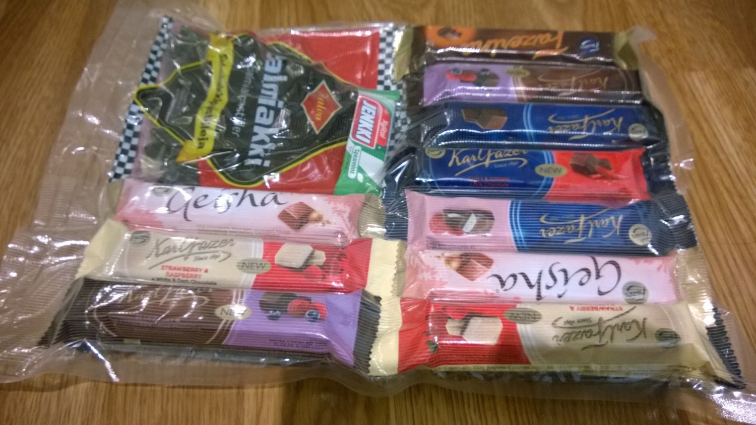 You're getting an assortment, 10 different chocolate bars, two of each, a bag of salmiakki (Finnish specialty, sort of like liqorice but way better), and some xylitol gum, spearmint flavored.