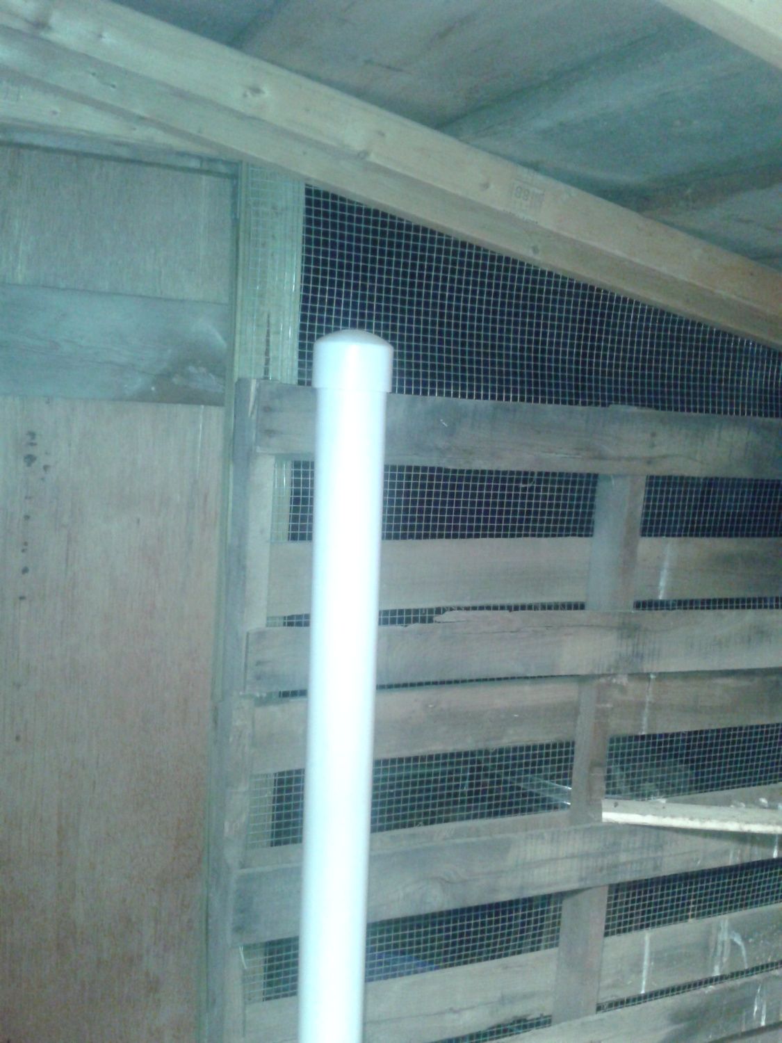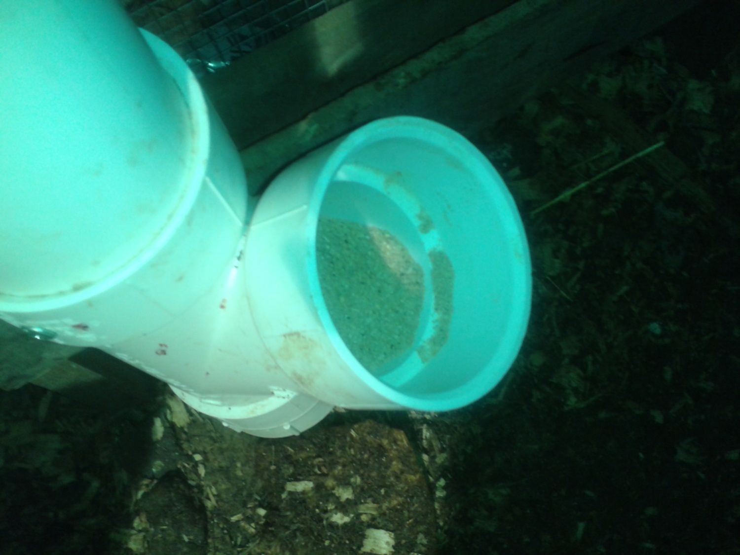 John this one is 3 inch, my newest is 4 inch but I used a 4 inch to 3 inch y so as to keep the opening smaller to keep them from raking out the feed. I plan on doing a similar design in my first chicken tractor but use some angles to make it refillable from the outside.