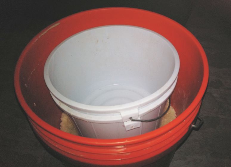 ii. You should now have the bottom 5 quart bucket pretty well glued within the 5 gallon bucket