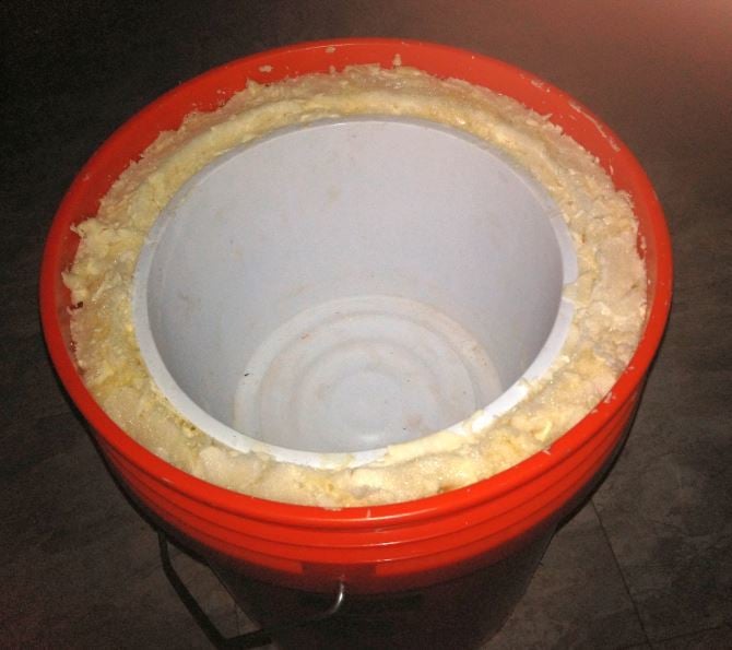 ii. Fill in the outside gaps between the 5 gallon bucket and the 5 quart bucket until the foam is half way up the sides