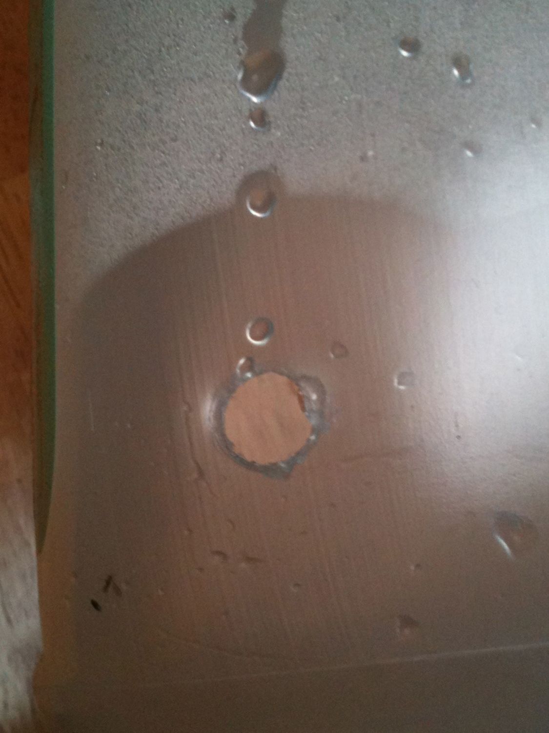 Hole drilled with 3/8" bit. It's smaller than the plug...you have to pretty much force it in until you get to the threaded part, but it screws in and keeps from dripping until I get to the water pan.
