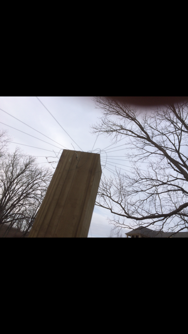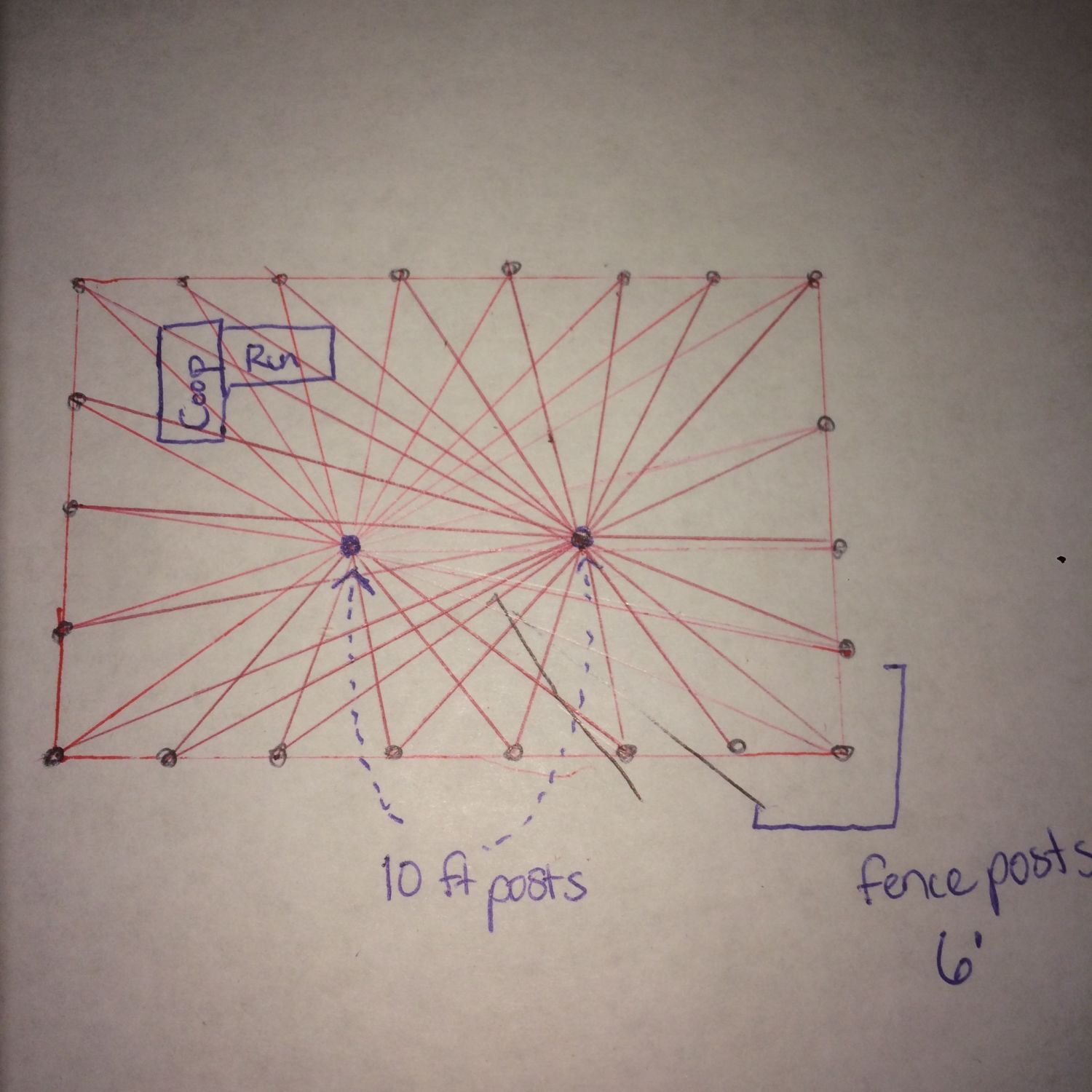 The fence allowed protection from gorund-predators but didn't provide a solution for the real problem, the predators from the sky. This gave me an idea to create a fishing line-webbing atop each fence post, spanning above the coop and across the whole fence-pin. My design required two 10 feet beams placed generally centered in the pin and equally distant from each side of the fence. Each 6 ft post holding up the fence has an eye hook drilled into the top allowing strong Spiderwire fishing line to be attached from the tops of each post to both center posts.