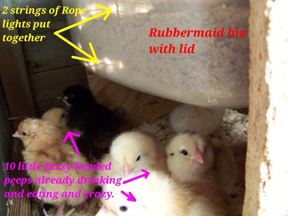Not so sure it's all that pretty or innovative since I had the idea pop into my noggin while reading on this site. But I like to think using the weatherproof "rope light strings" is just shy of being normal....for me. It's a plain jane Rubbermaid 14"x10" approx. tote/storage box with a snap-on lid. It has 2 strings of the enclosed weatherproof little bitty lights joined together (factory coupler built in them) with one power cord going out a small slot in the top snap-lock ridge. And both strings are covered up and around by about 10-15 pounds of sand. The box is about 1/2 to 2/3 full. There are reinforcing blocks of wood inside on each end to screw the end outside legs (legs 8"wide for stability by 12" tall) through and make sure the legs are sturdy. It's approx 6" above the floor for "peep clearance". With just one string it only ran about 12 +- degrees F. above room temp (about 85-90F). With 2 strings joined it runs at about 105F and the peeps are happy under it. I have it plugged into a portable receptacle and dimmer combo I made for the last spring's chick brooding.