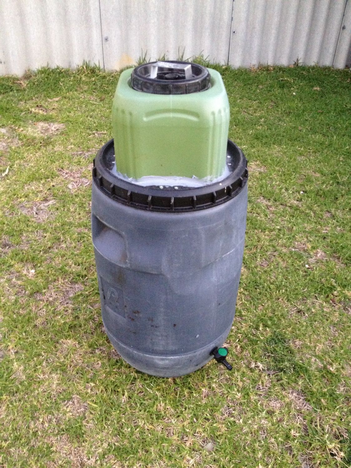 Got the tap in the trial - MK I Super Dooper Pooper to Fertaliser Conversion Barrel - (or MK-I-SDP2FCB for short hahaha) Made from some old bits laying about. Two stackable bulk olive drums inside a larger screw top olive drum. Idea is to load the top barrel with the fresh stuff, this gets a bit of water washed in once a week or so. The liquid filters through the droppings into the second barrel. Gravity holds back any solids, the liquid passes out the high holes into the large barrel, where it can be run off via the low tap, watered down and used on the lawns.