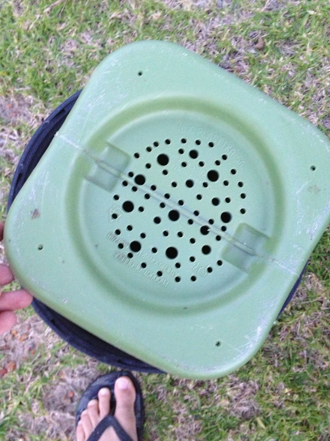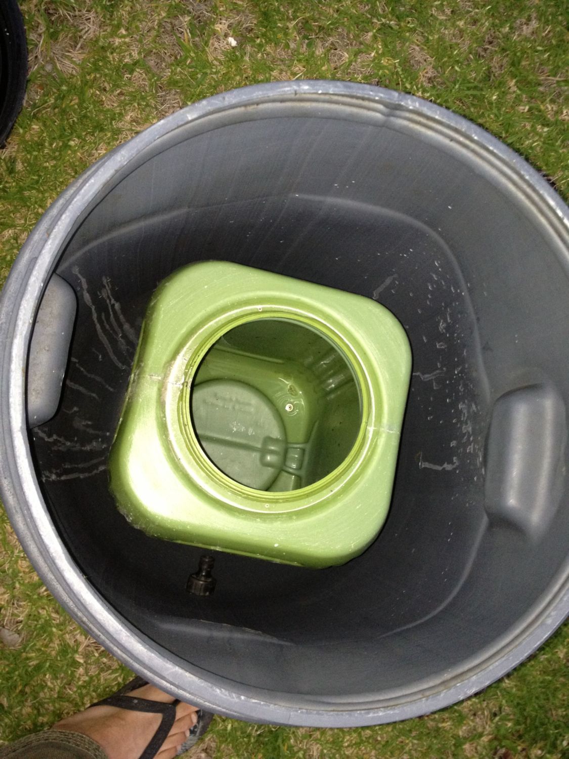 Lower barrel is drilled on all four sides right up the top, allowing any small solids to settle to the bottom, and the liquids will pass out the top. Timber slats are just to make the bottom stable, as the grey drum is a bit beat up.
