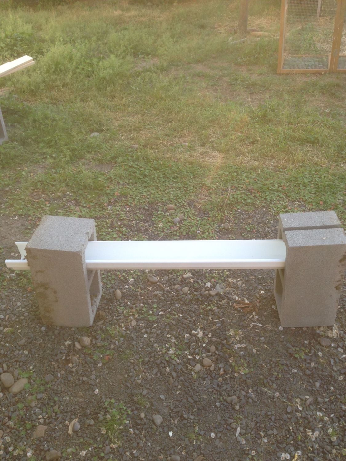 Stack the cinder blocks about 8' apart, two high, with the holes facing each other. Put one end cap on a gutter, if using. Feed this gutter into the upper holes (if chickens are close to full grown). Put something under this gutter to help support it in the middle -- a log, or something. Put food in trough. Lay the other gutter upside down directly over the feed trough. This helps keep the chickens from getting up in it and scratching and pooping in the food.