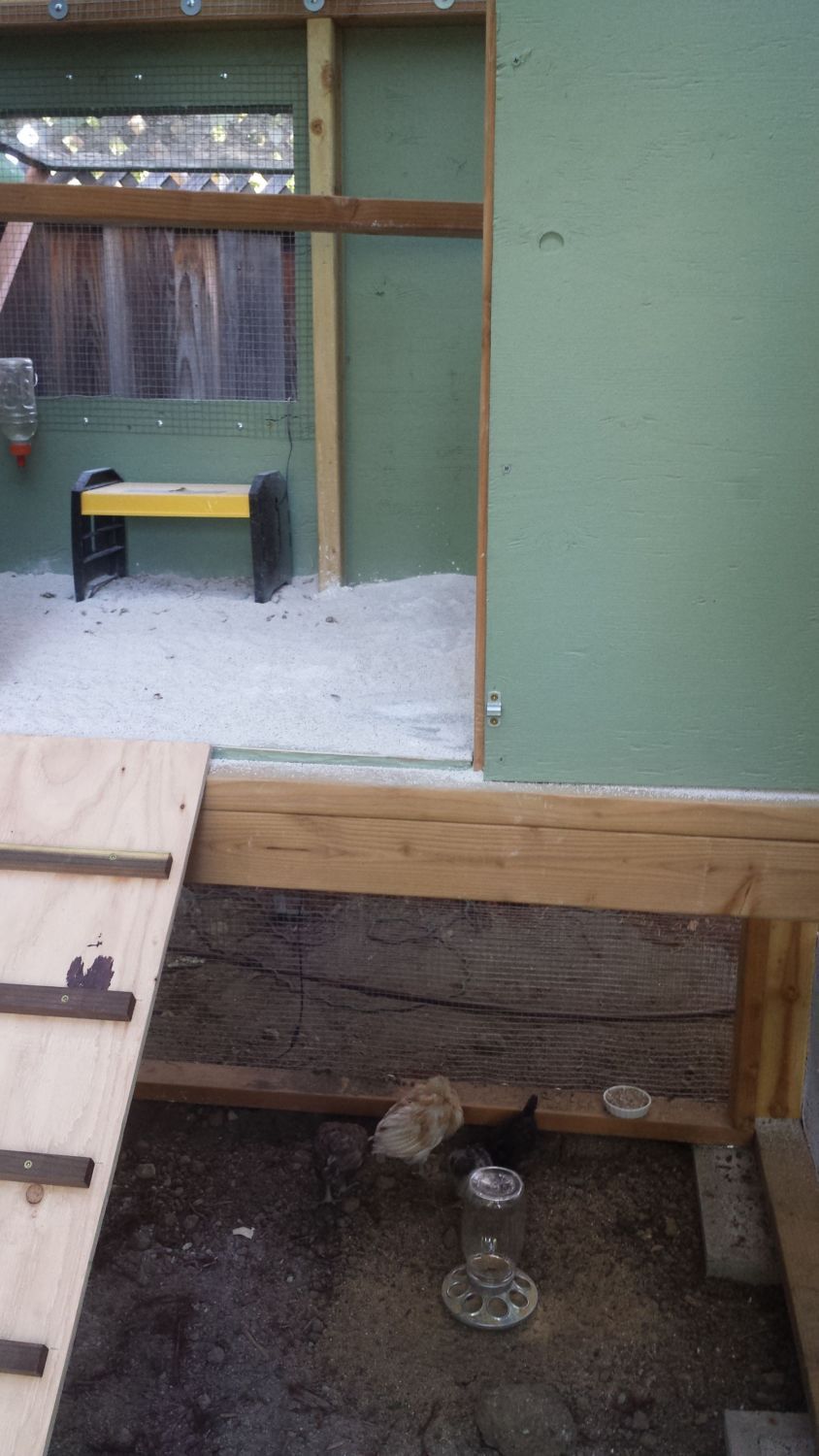 Here's a photo of my setup. Last night the human access door shown in the photo (the ladder is there temporarily) was closed and the chicken access door that's just to the left of the photo is boarded up until they know how to get back to the heater at night.