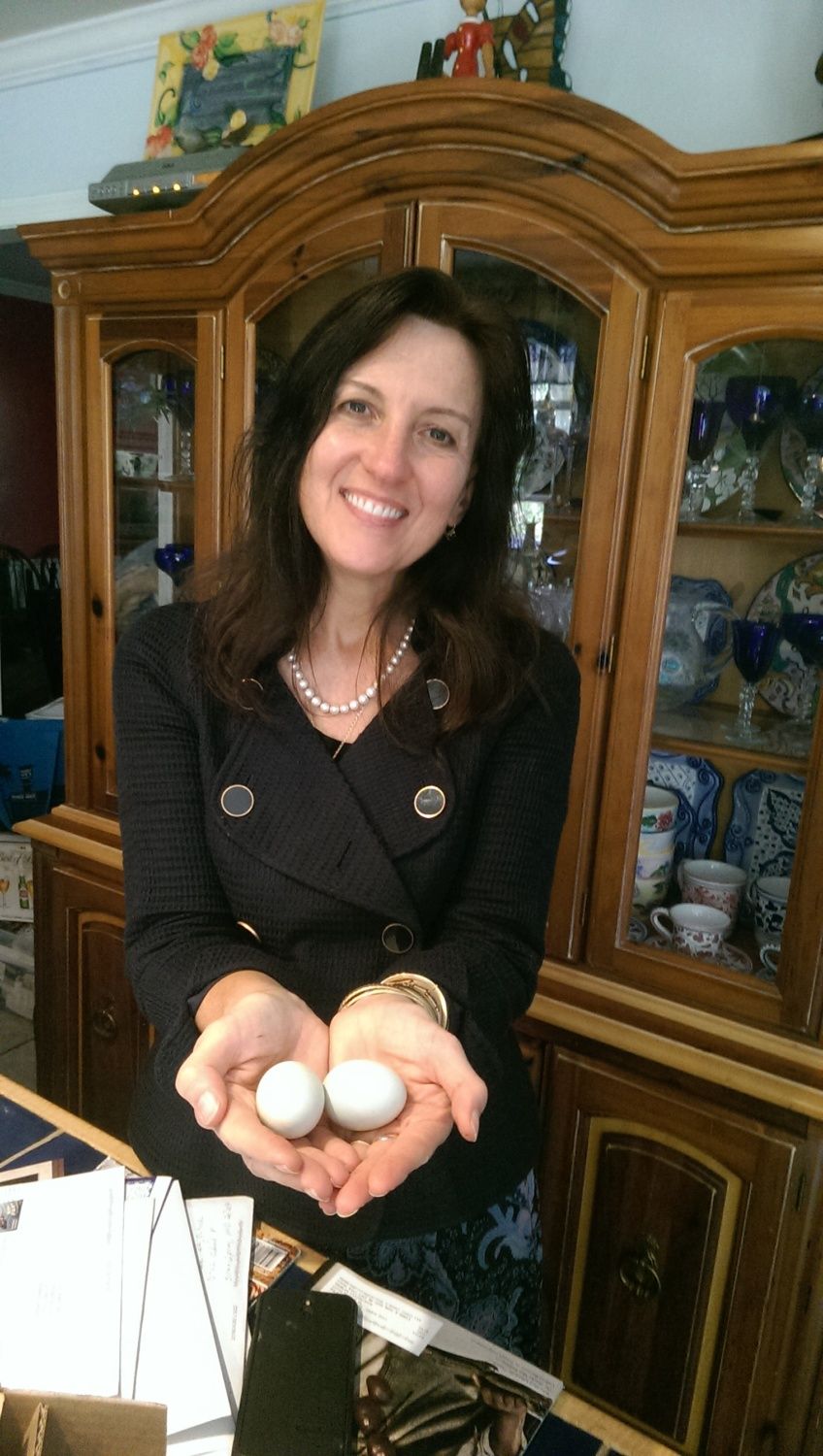 Seriously, they're not very big! Don't be fooled by the camera angle, my darling bride has very small hands. Will the eggs from this hen get bigger over time? It would take a dozen of these to make a medium sized omelette!