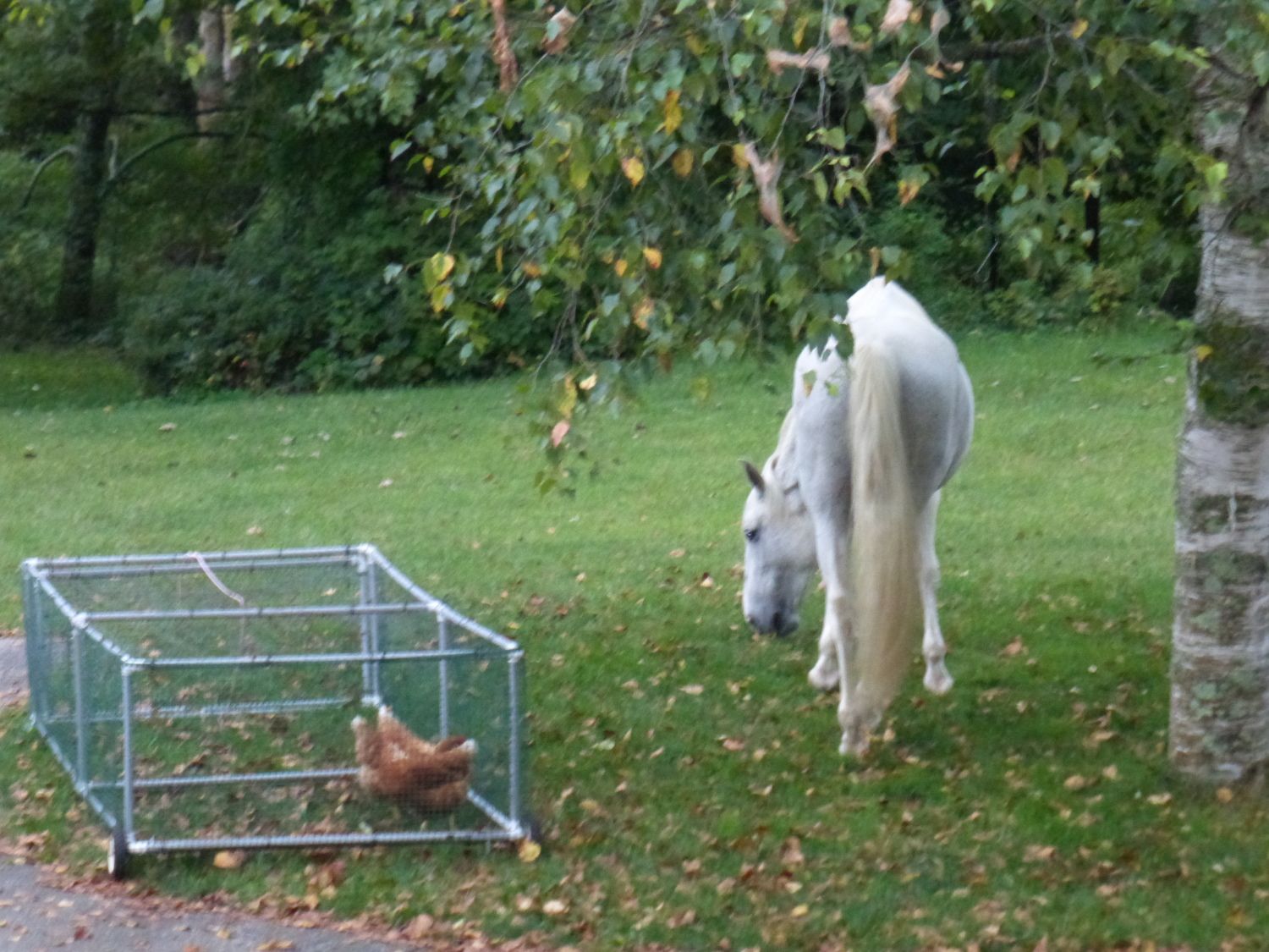 I "gave" my father a "project" a few months ago, to construct a "chicken tractor" for my 3 chooks. It was fun to put together, actually, sort of like Tinkertoys for adults: PVC pipes, plumber's glue, chicken wire, wheels + axle from some deceased lawn equipment, and tah-dah! The Girls get some time outside of their coop/run to scratch in the grass. Oh, and they keep my mare company when SHE is allowed onto the lawn (it is quite true, "The Grass Is ALWAYS Greener on the Other Side of the Fence"!)