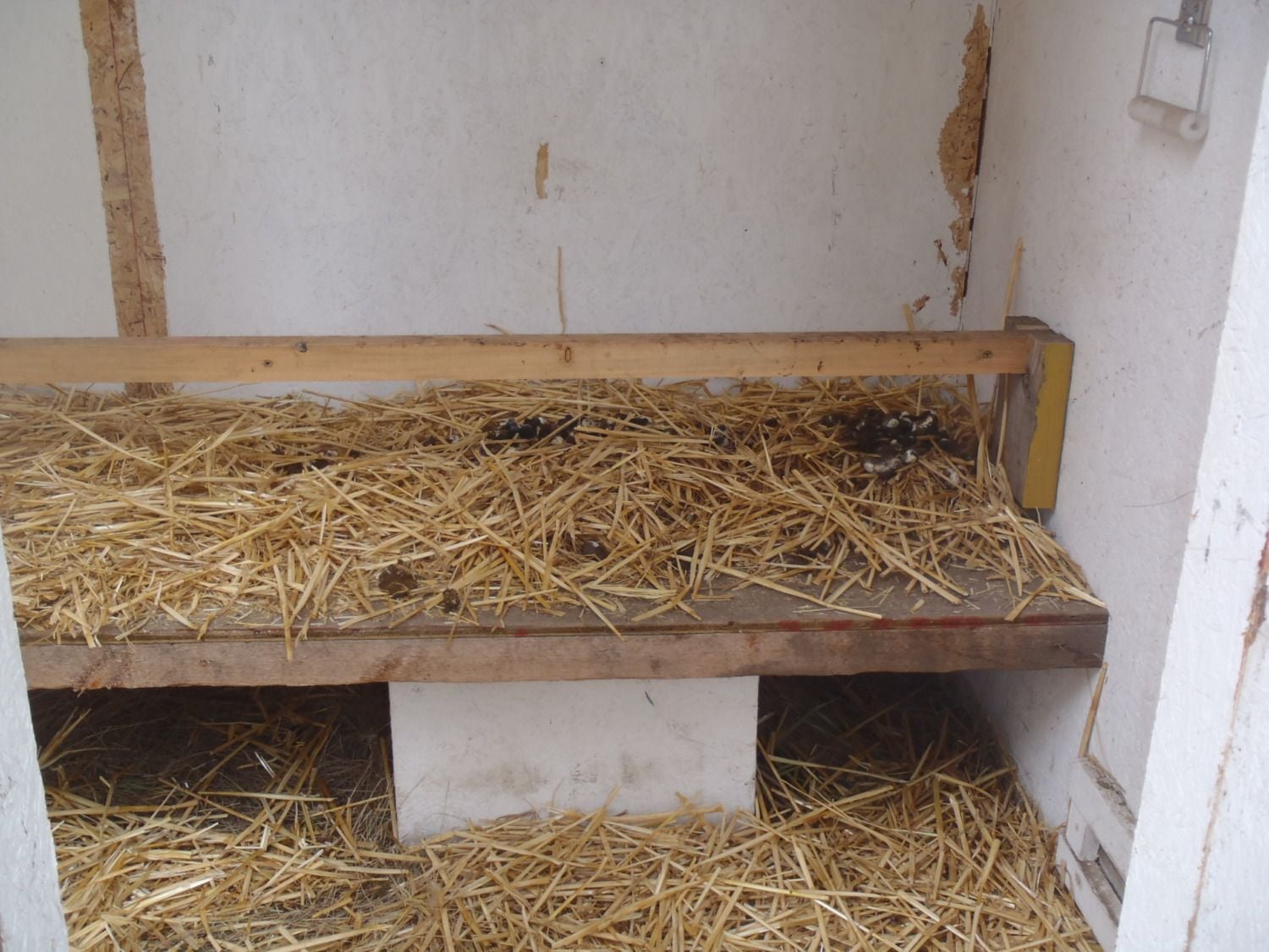 This is the right half of the coop. One of my girls was busy laying so I didn't take any photos as to not disturb her, but the left side matches the right side. The only difference is the left side has the nesting box. We removed the partition wall and toilet seats. We put a thick board on top of the toilet boxes, then put a perch on top of that.