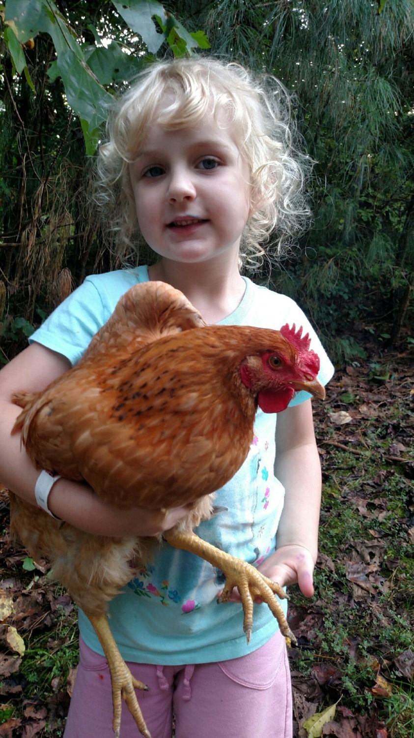 They told me she is a Dixie Rainbow AKA Pioneer. She is HUGE compared to my others. I have 2 black sex links and they don't look even close to ready. Here is a picture of her body with my 5 year old holding her. She weighs a ton!Is she a red sex link? The picture kinda looks like that. I've read it is not uncommon for them to lay at 4 months. I have 19 of them and almost all were slow to develop for some reason.