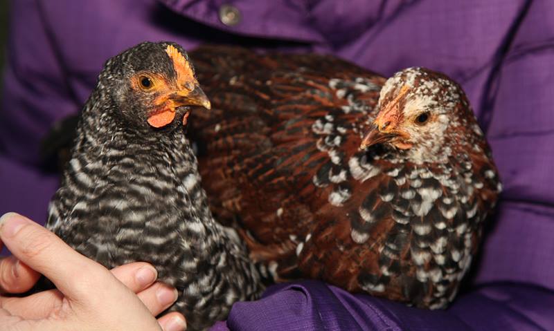 I have had a few VERY cuddly hens. My barred rock hen Sweet Basil will fly up to my arm and snuggle me--she loves sitting in my lap for as long as I will let her, and though she'll accept treats if I offer them to her, she's much more interested in being held. Recently, I hatched a batch of home-grown mutts, and they are so cuddly that we have a hard time putting them down. My mother was trying to take pictures of them the other day, and ended up with several little chickens climbing up her arms for a cuddle!