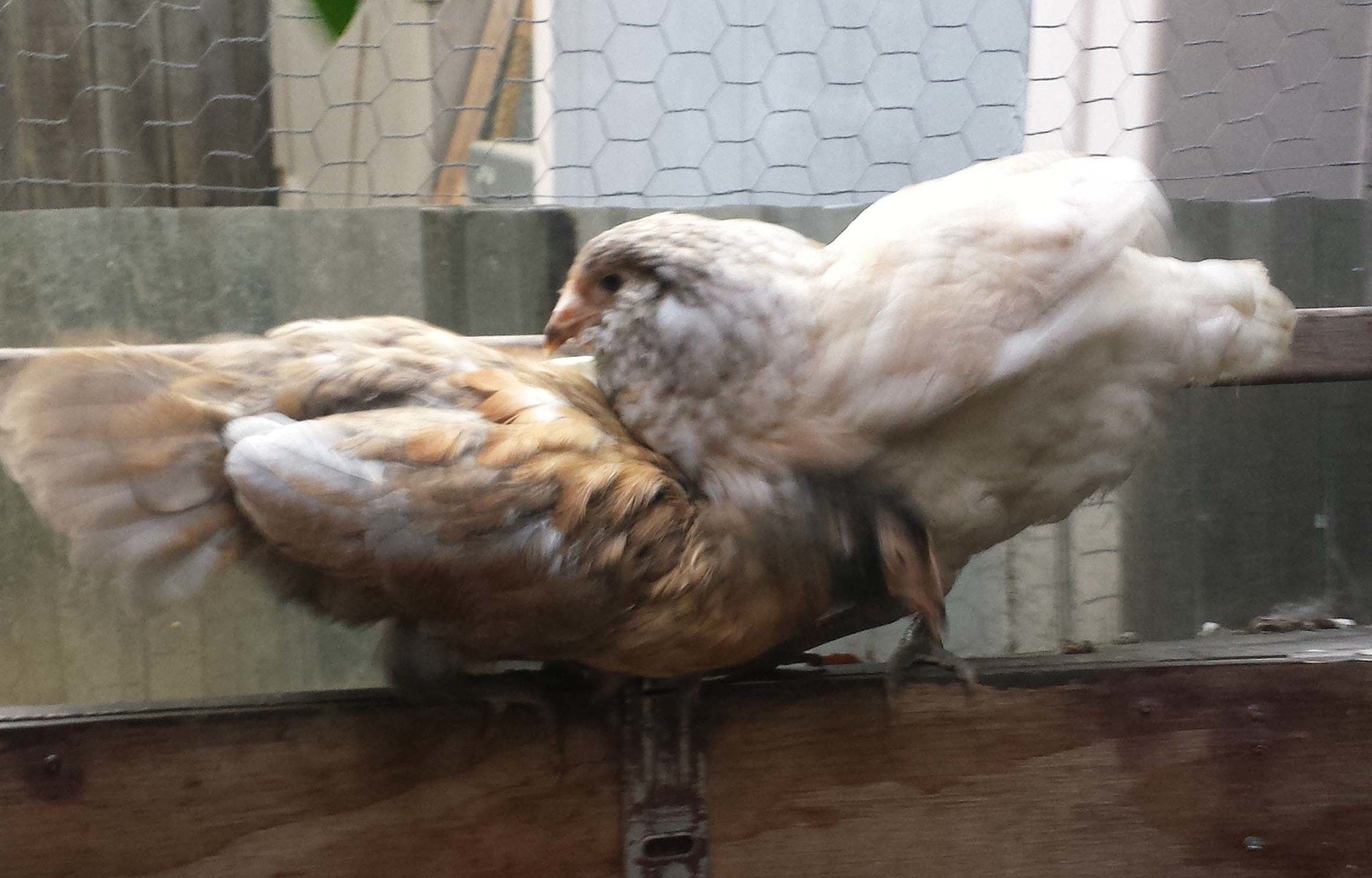 The SS was sleeping alone for several weeks till she decided this. They are close to the same age. The SS has scoots all the way to the end if the roost against the pen wall. The Am will nudge the SS with her head and make peeping sounds. She does not peck her. But she is either being pushy or affectionate. I really can't tell.