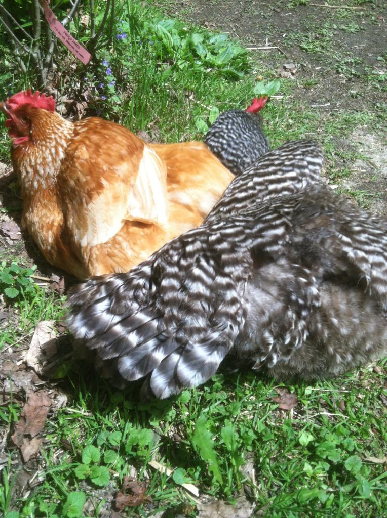 The Barred Rock in the picture does seem to be the one in my flock that finds close personal relationships the most important- for about 6 months, she and my "head hen" (a Rhode Island Red) were the only two chickens while I was rebuilding the flock, and they are almost always together now (this picture being a rare exception). They are always right next to each other on the roost, and almost always side-by-side while free ranging. I have also seen a few nights where the RIR will put a wing over the BR on the roost, sort of like the rooster behavior someone else described.