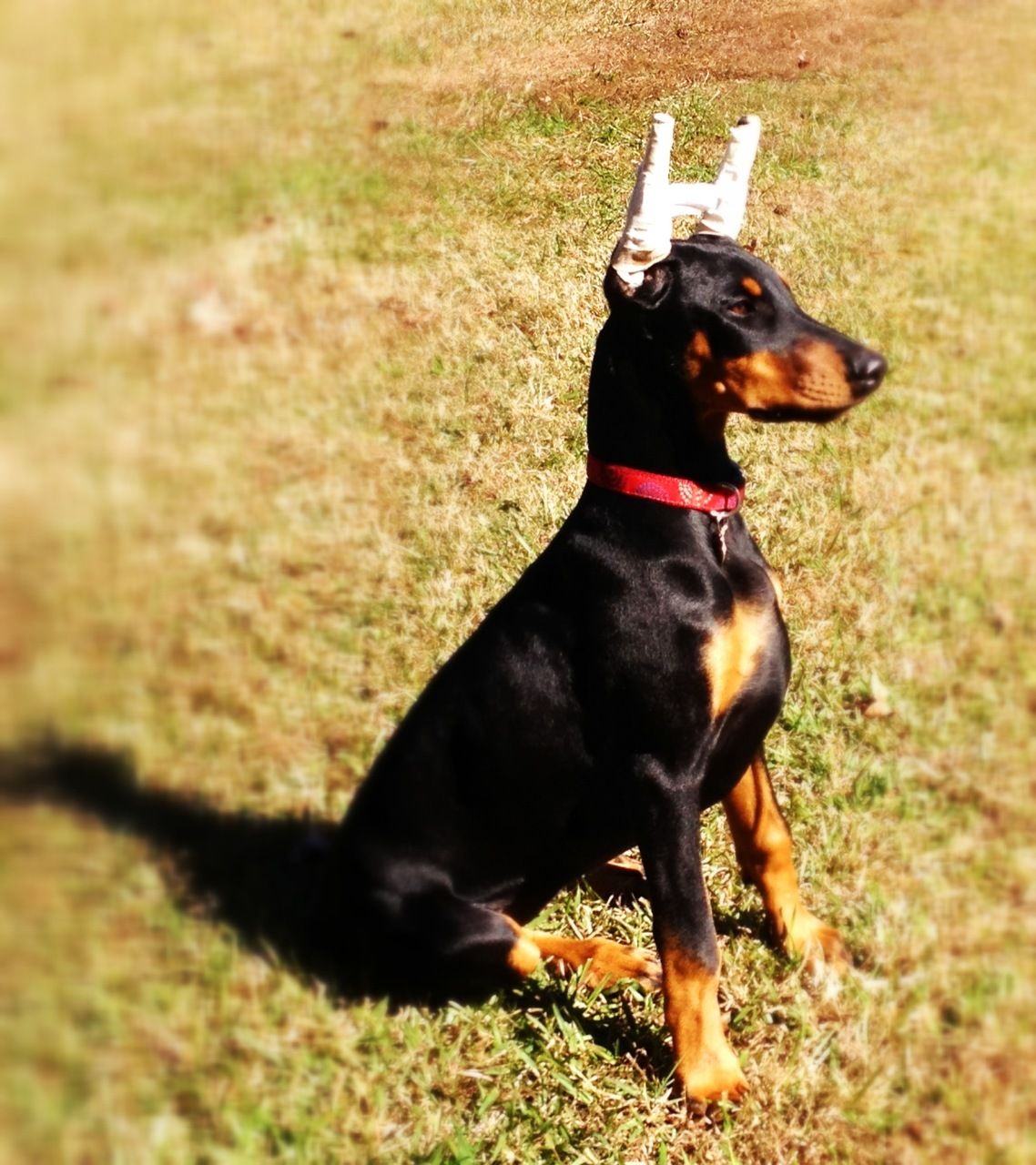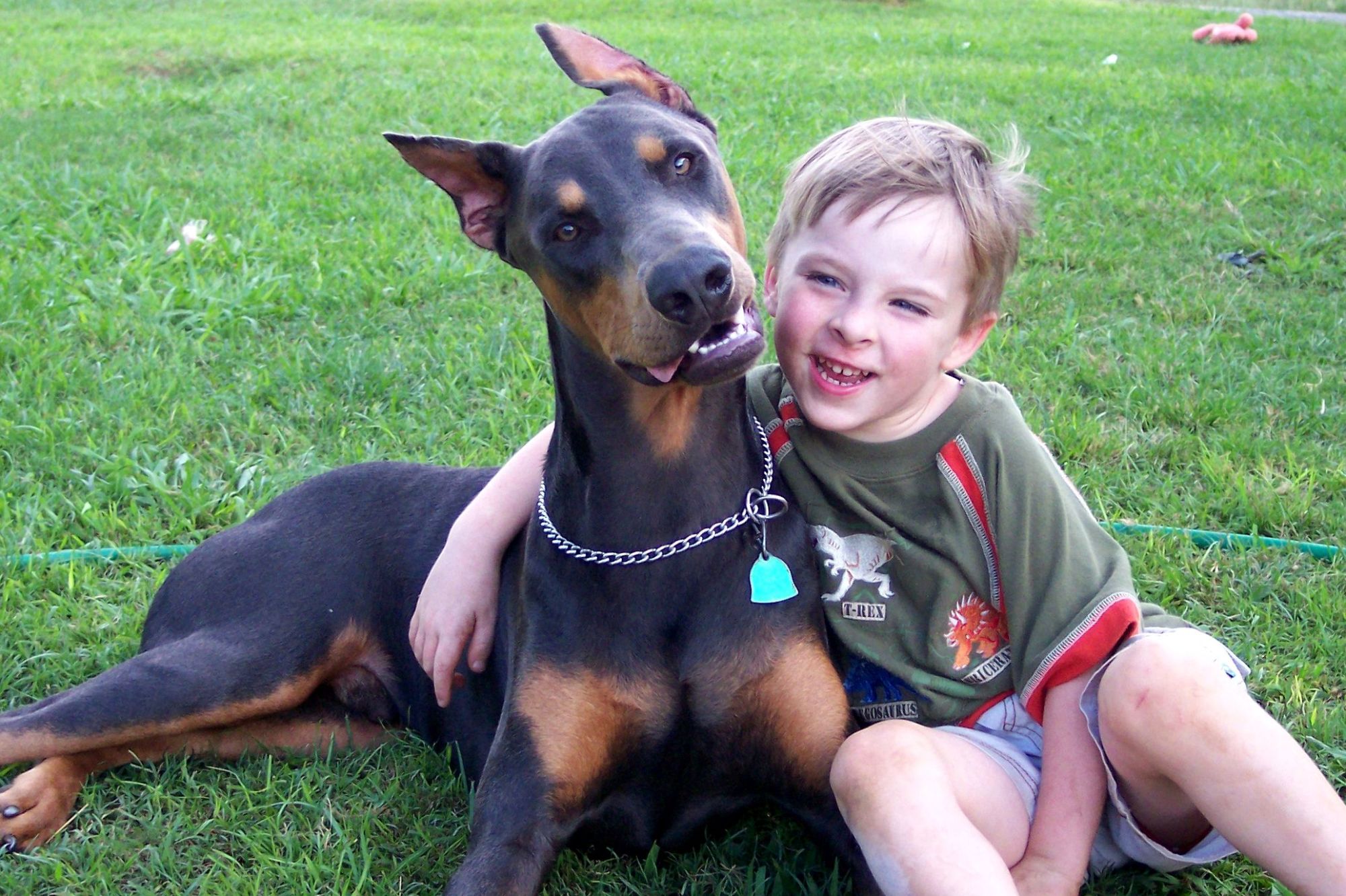 Higgins has a "broken" ear from a poor crop job and is going bald due to colour diluted alopecia. He does want to play with the chicks and chickens but in just one afternoon I managed to 90% break him of it! I can't get over how intelligent he is and how quickly he learns! Never, ever, did we ever think we'd wind up with a doberman, now we're so glad we did!