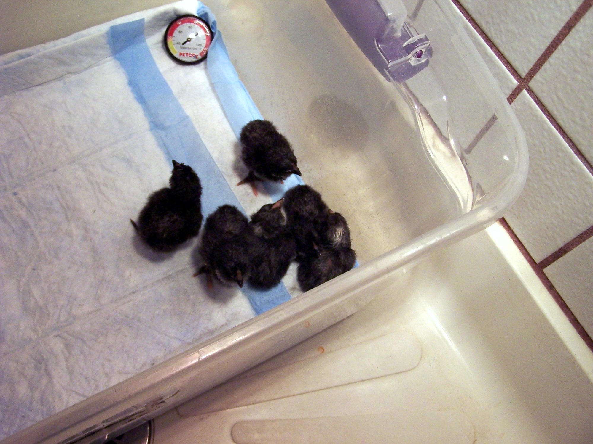 These chicks are black sexlinks. The females are all solid black, with a bit of white down under the throat. The two boys have the head spots. One just has a tiny smudge. The other has a more noticeable spot.