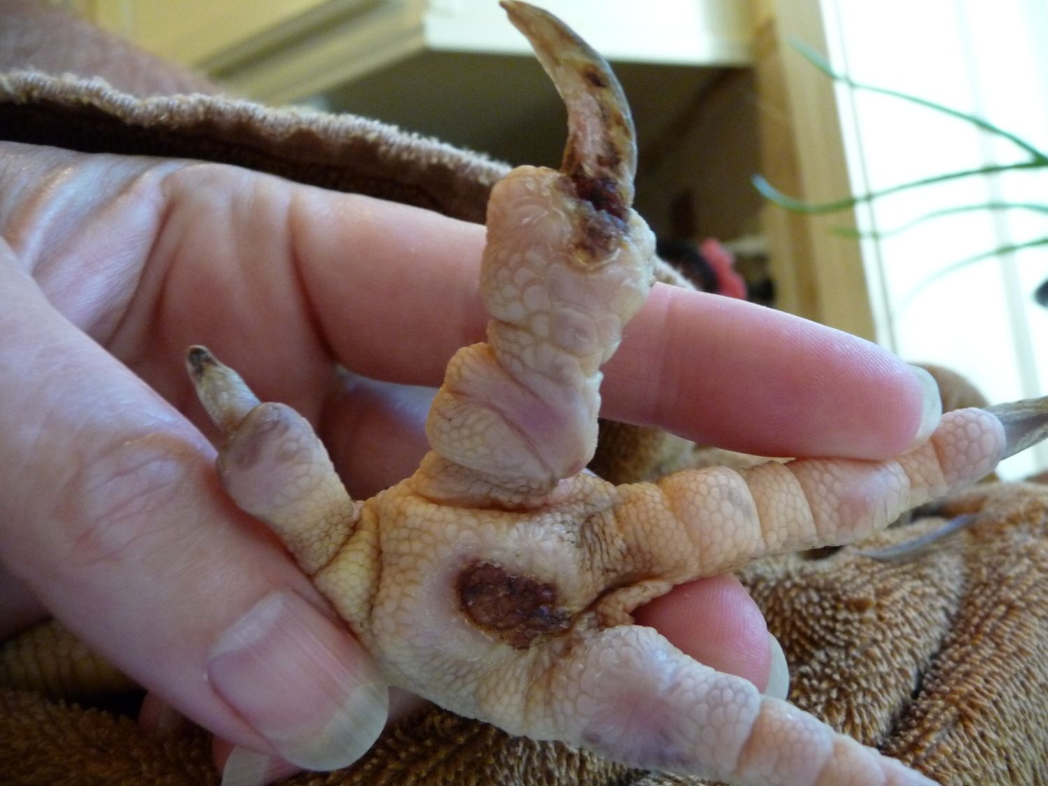 Now, after a few weeks of seeing that she is on the mend, you can go a few days in between wrappings. But I will worn you that vet wrap that gets wet, is a bear to get off! So keep scissors handy. I found some human grade wrap at walmart, the brand name is "Coach", that is easy to get off after a few days. Although if you are doing a lot of wrapping, it is cheaper to use vet wrap. Vet wrap comes in a 4 inch length and I cut it into 4 sections with a sharp razor blade that has a handle on it. DON'T cut yourself, or you will be treating YOURSELF for bumblefinger!!! LOL