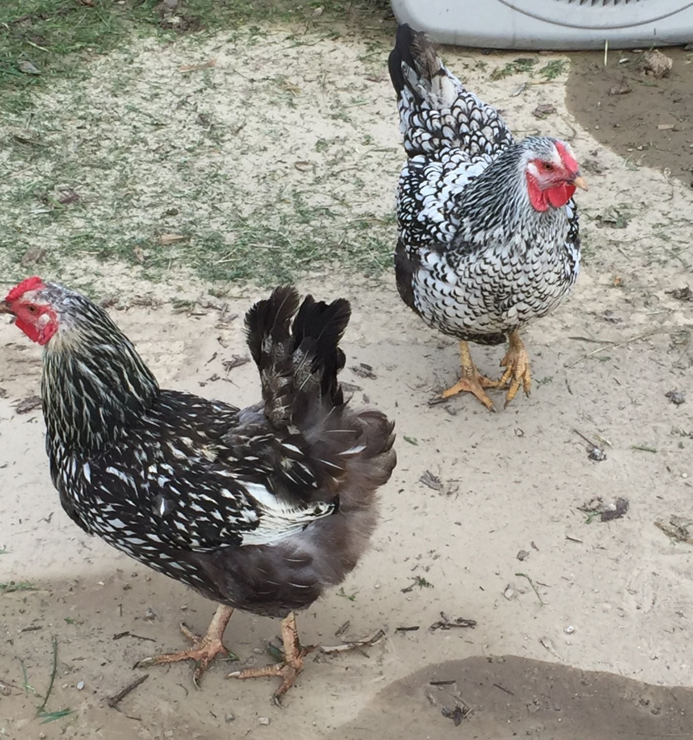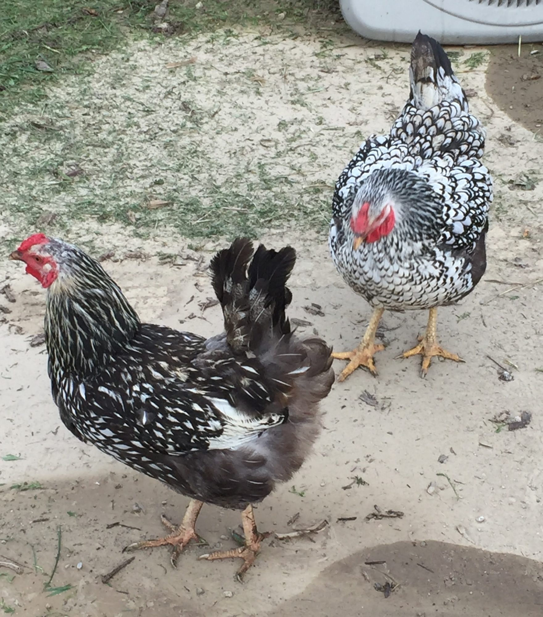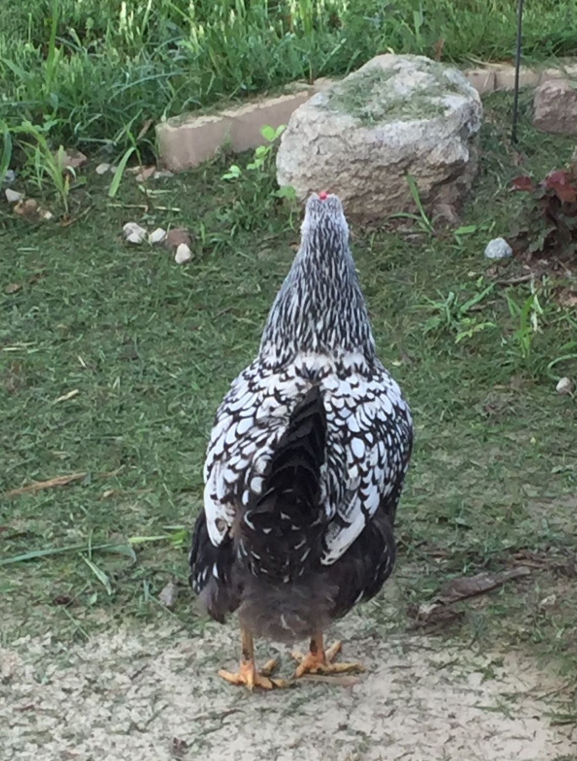 This is one of my Silver laced Wynadottes, Laverne. Does she look fat? You can see she looks and is built completely different than my other SLW, Shirley. She is much heavier and broader built. She also has a few issues that I am concerned that maybe caused by being too heavy. I have had an issue with very thin shelled eggs being layered, so thin they break in the nest. I have narrowed it down to being her that lays them. And she goes broody just about monthly. Oh and she can't run. When the other chickens take off running she ends up hopping and flapping her wings.