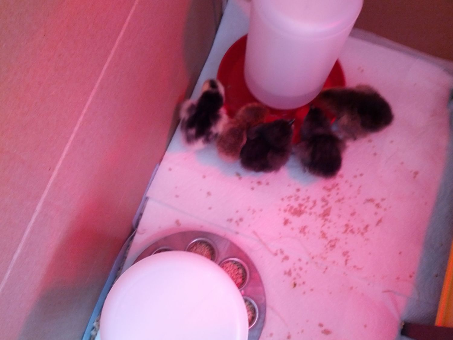 They're all peeping and wandering around. They've gulped down a lot of water and are trying out the starter feed!